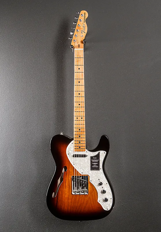 3 Color Sunburst, Сделано в Мексике, Глянцевая полиэстеровая отделка корпуса, Полуполый корпус из ясеня, С-образный гриф конца 60-х годов с кленовым грифом радиусом 7,25 дюйма и винтажными высокими ладами, длина мензуры 25,5 дюйма, ширина порожка 1,650 дюйма, однокатушечный бридж Tele в винтажном стиле 60-х годов и нековые звукосниматели, 3-стороннее переключение с помощью регуляторов общей громкости и тембра, Струнный телемост в винтажном стиле с тремя стальными швами с прорезями, винтажные тюнеры Fender F штампованные, 6,8 фунта, с чехлом