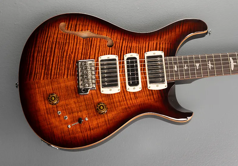 PRS SE Special Semi-Hollow оснащена парой звукоснимателей 58/15 LT “S” с PRS Narrowfield DD “S” в средней позиции и универсальной системой переключения катушек, которая открывает широкий диапазон тембров - от теплого, полного звучания хамбакера до яркого звука сингл-котлов. Эта Конфигурация с тремя датчиками позволяет получить уникальные тональные возможности, делая эту модель идеальной для жанров от джаза и блюза до рока и не только. Оснащенные тюнерами, разработанными PRS, и запатентованным тремоло PRS, PRS SE Special Semi-Hollow обеспечивает надежность, пригодную для концертов, с качеством звука для студийной записи.Orange Tiger Smokeburst, полуголое тело из красного дерева с одним резонаторным отверстием F, верхняя дека из тонко фигурированного клена с карвинговой обработкой, накладка из розового дерева радиусом 10" с инкрустацией в виде птиц на широком тонком карвинговом грифе из клена, ширина порожка 1 11/16", длина мензуры 25", звукосниматели S на грифе и мосту 58/15 с картриджем Narrowfield DD "S" на среднем положении, регуляторы громкости и тембра с 5-позиционным переключателем звукоснимателей и двумя мини-переключателями Coil Tap, запатентованное тремоло PRS и тюнеры PRS, вес 7,2 фунта, поставляется с чехлом для переноски.