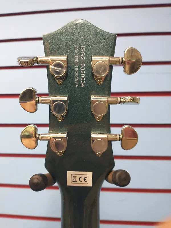 Доступна в стильных отделках, включая Golddust, Gunmetal, Imperial Stain и Vintage White, G2210 также оснащена анкерным компенсированным мостом типа wrap-around, синтетическим костяным порожком, грифом с окантовкой, ручками управления в винтажном стиле, черепаховым планком и никелевой фурнитурой.