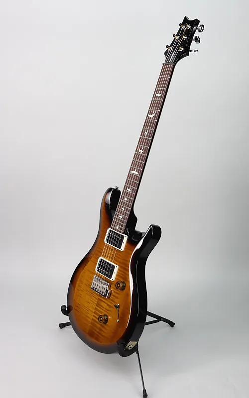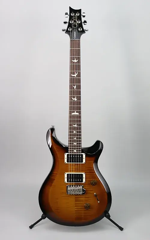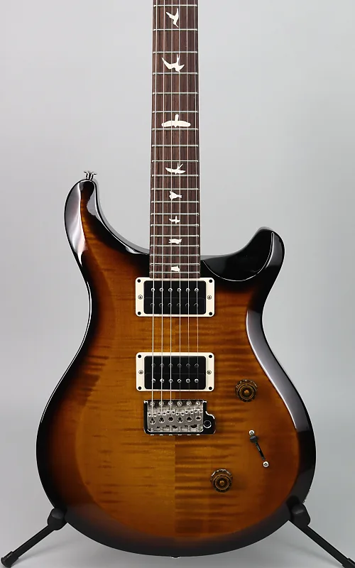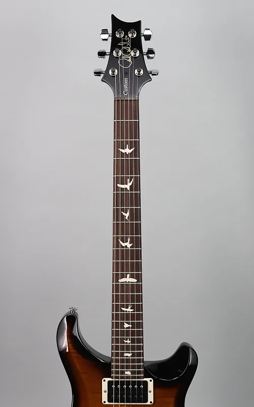 Технические характеристики: Крышка из клена; корпус из красного дерева; гриф из красного дерева (тонкий профиль); грифовая накладка из розового дерева, 24 лада; мензура 25"; ширина грифа 1-11/16"; никелированная фурнитура; инкрустация в виде птиц; тремоло мост PRS с запатентованной системой; колки с низкой массой и фиксатором PRS. Глянцевое покрытие Nitro Black Amber. Входит чехол PRS.