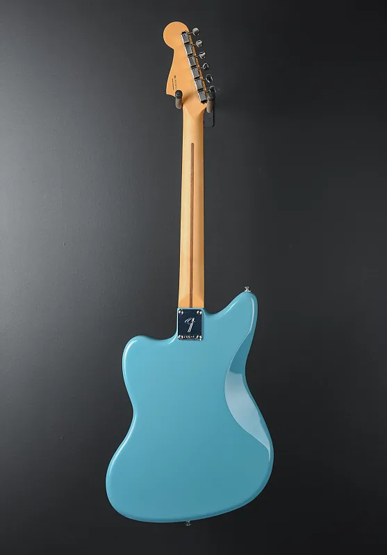• Aquatone Blue, сделано в Мексике, глянцевая полиэстеровая отделка корпуса, корпус из ольхи, современный C-образный кленовый гриф с пластиной радиуса 9,5 дюйма из палисандра и средними джамбо-ладами, длина мензуры 25,5 дюйма, ширина порожка 1,650 дюйма, бридж и нековые звукосниматели серии Player Alnico 5 Jazzmaster, 3-позиционное переключение с регуляторами общей громкости и тембра, Бридж Jazzmaster с седлами Mustang, парящее тремоло в винтажном стиле и тюнеры Fender ClassicGear, 8,2 фунта, чехол в комплект не входит
