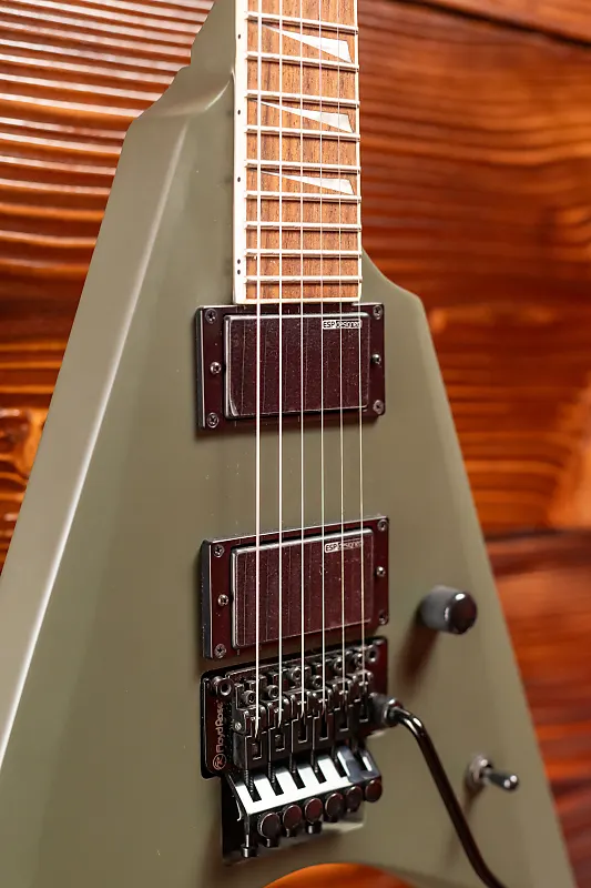 Электрогитара LTD ARROW-200 в прочной отделке Military Green Satin - это впечатляющий инструмент с высокой энергией, созданный для музыкантов, которые хотят выделяться своей культовой формой Flying V, идеально подходящей для рока, металла и других жанров. Благодаря конструкции с соединенной гриф-платой и мензурой 25,5 дюйма, она обеспечивает легкий доступ к самым верхним ладам и дает резонансный, мощный тон через корпус из махагони. Гриф из трех частей клена обеспечивает стабильно высокую прочность и яркий тональный характер, а грифовая накладка из розового дерева с 24 экстравеликими ладами и смелыми треугольными инкрустациями из белого перлоида обеспечивает плавность игры и точную артикуляцию. Оснащенная хамбакерами ESP LH-301 с элегантными черными крышками, эта гитара производит агрессивные, чистые тона, идеально подходящие для тяжелых жанров. Тремоло LTD от Floyd Rose позволяет исполнять динамичные, эффектные соло с надежной настройкой, идеально подходя для выразительных спусков и бендов. Обратная головка грифа с отделкой в цвет Military Green Satin добавляет свирепая эстетика. LTD ARROW-200 в цвете Military Green Satin - это доступная гитара, ориентированная на производительность, которая сочетает в себе смелый дизайн с мощным звуком, позволяя игрокам доминировать на сцене с уверенностью и стилем.