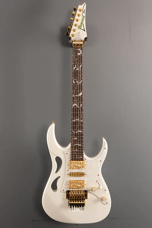 Stallion White, корпус Alder, гриф радиусом 17" из палисандра с инкрустациями PIA Blossom и джамбо ладами из нержавеющей стали на пятиречной шее из клена/ореха формы PIA, мензура 25,5", ширина верхнего порожка 1 11/16", хамбакеры Dimarzio Utopia на мосту и грифе и сингл-коил Utopia в середине, 5-позиционный переключатель с push-pull высокочастотным фильтром для регулировки громкости и тембра, тремоло Edge с блокировкой и колки Gotoh, вес 8,0 фунтов, в комплекте с жестким кейсом Ibanez.