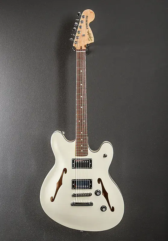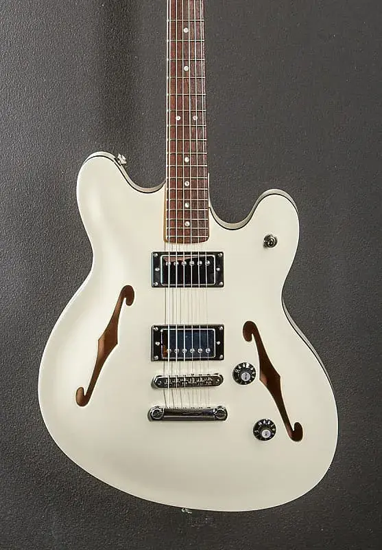 Олимпийский белый, Сборка в Индонезии, Полированная полиуретановая отделка корпуса, Полуакустический корпус из ламинированного клена с центральным брусом, Гриф из клена C-образной формы с радиусом 9.5" и накладкой из индийского лавра с узкими высокими ладами, 25.5"
