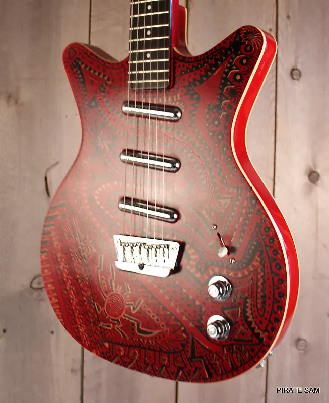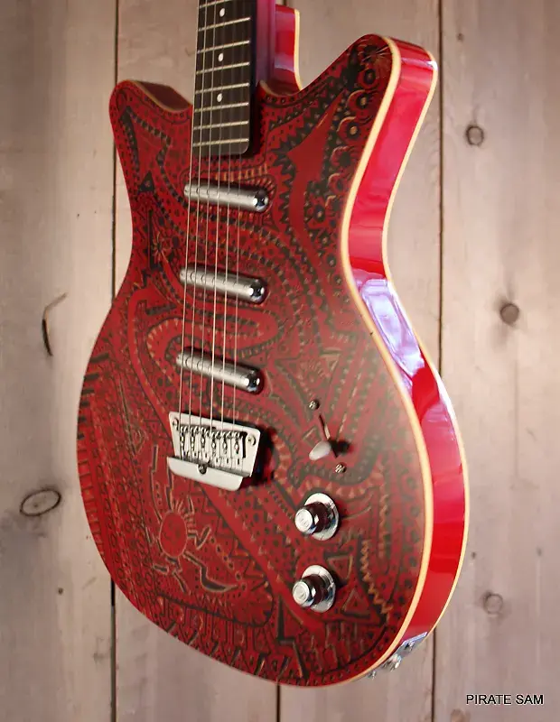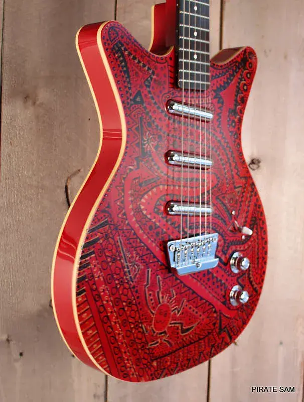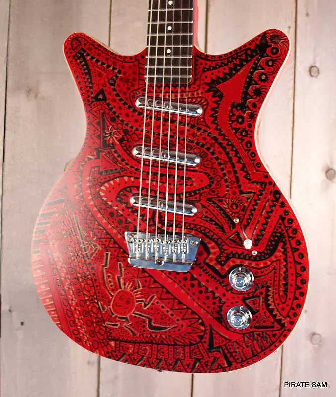 Я дилер Dano и я взял эту совершенно новую Dano и превратил ее в кастомную художественную гитару, как показано. Это еще одна художественная гитара Pirate Sam (Сэм Маккриди). Графика выполнена перманентными чернилами, затем на нее нанесено 5 слоев полуглянцевой краски, чтобы сохранить рисунок и одновременно сделать ее полностью играбельным произведением искусства!