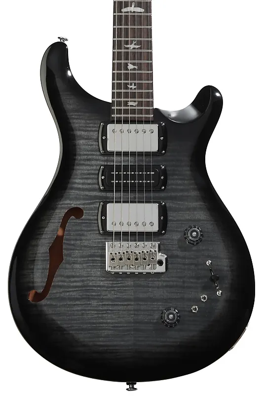 Полуакустическая электрогитара с кленовой декой, корпусом из махагони сзади и по бокам, кленовой шейкой, грифом из палисандра, тремя хамбакерными звукоснимателями и тремоло PRS - цвет Charcoal Burst.