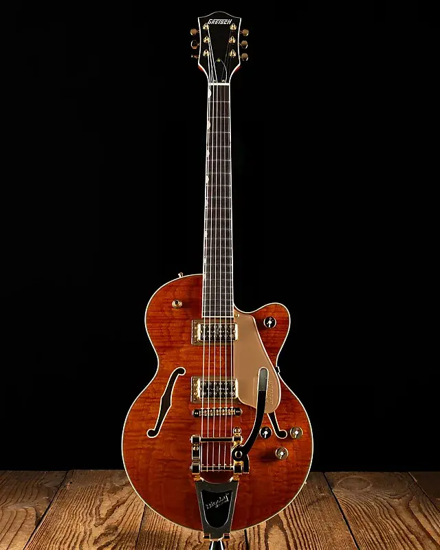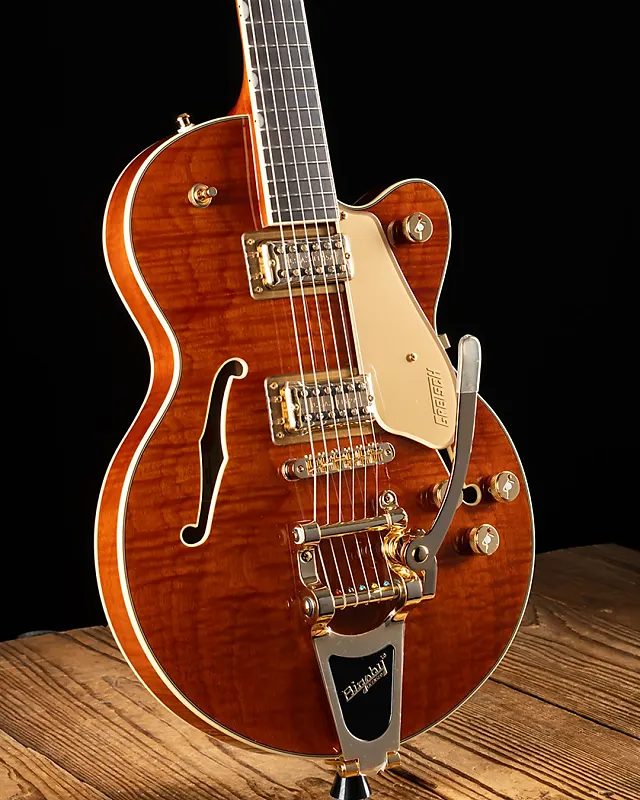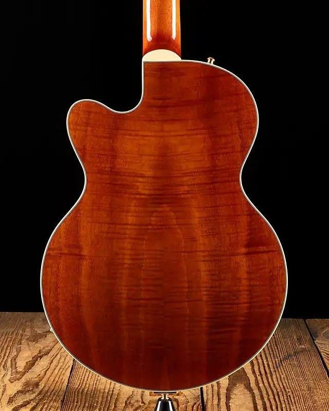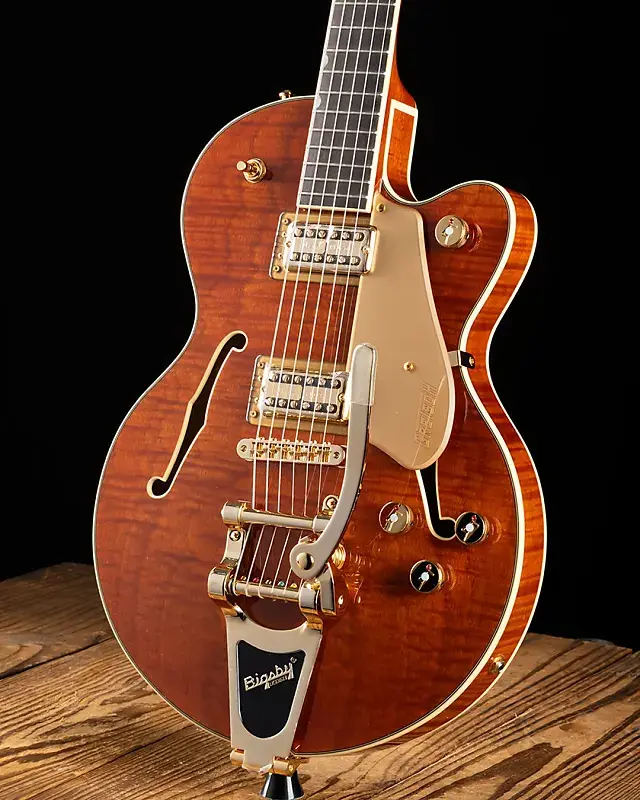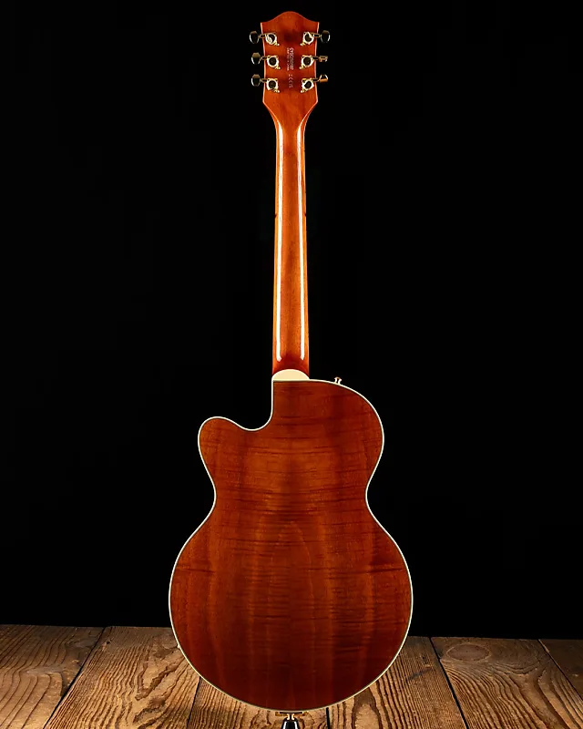 Благодаря красивому корпусу из огненного окуме с одним вырезом, палисандровой грифу, звукоснимателям США Full'Tron, украшенным драгоценными камнями ручкам управления G-Arrow и золотой фурнитуре, элегантный стиль и премиальное качество звука этой ограниченной серии Broadkaster Jr. обязательно привлекут внимание. ХАРАКТЕРИСТИКИ:
