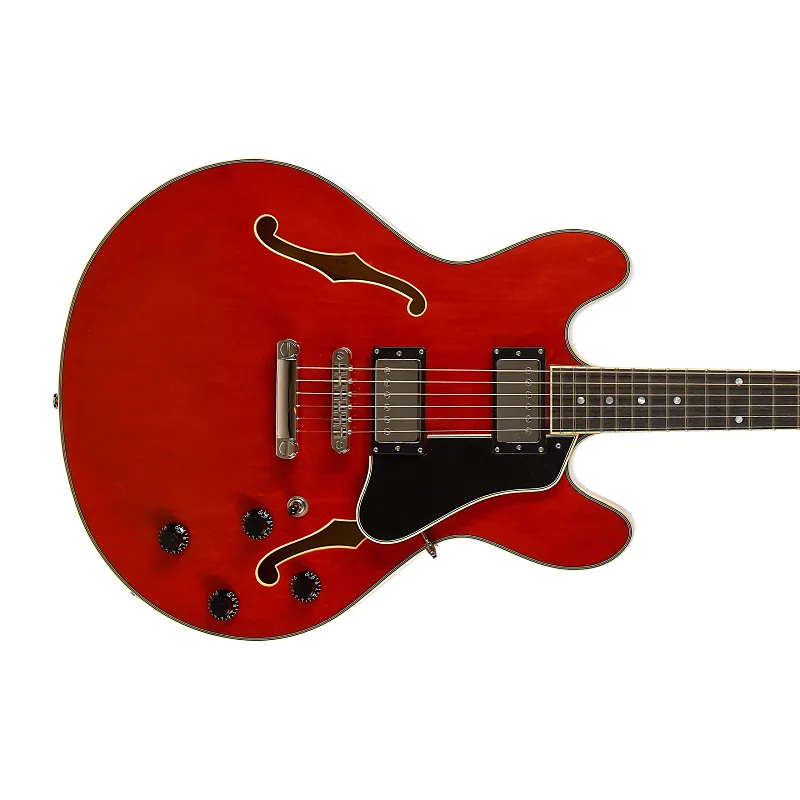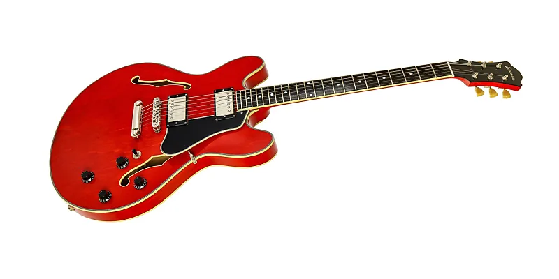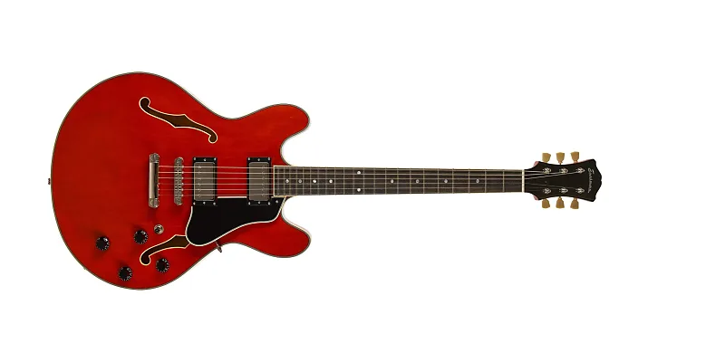 Eastman T386 Thinline Antique Red имеет корпус из ламинированного клена, гриф из клена, накладку на гриф из эбена, мост в стиле Tunomatic, колки Pingwell в винтажном стиле, звукосниматели Kent Armstrong HPAN-1, включая кейс.