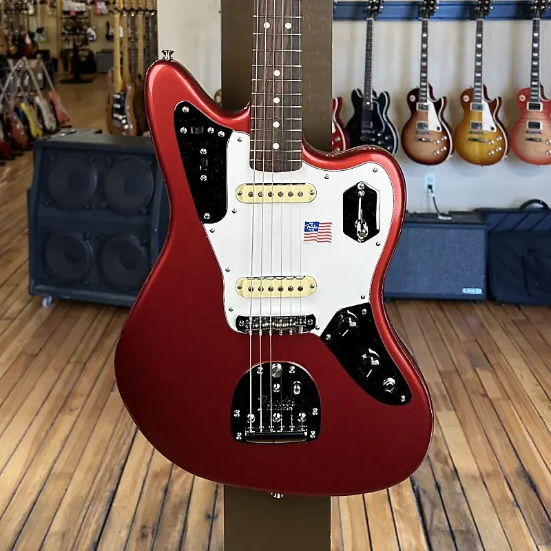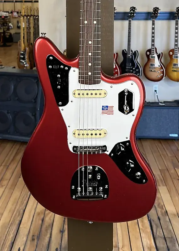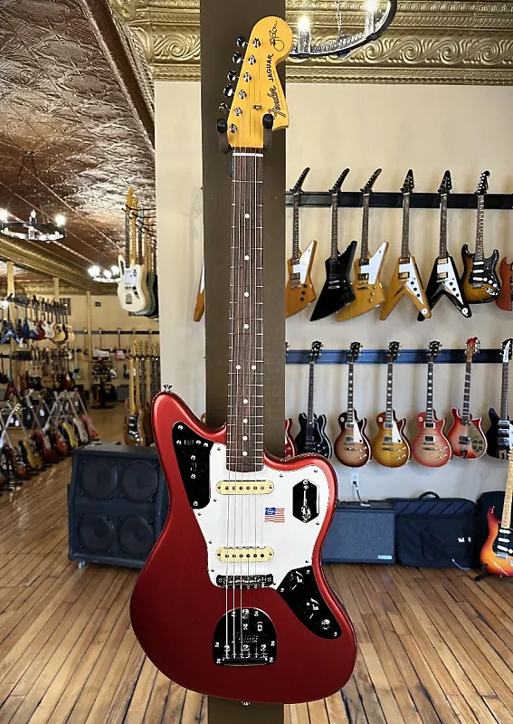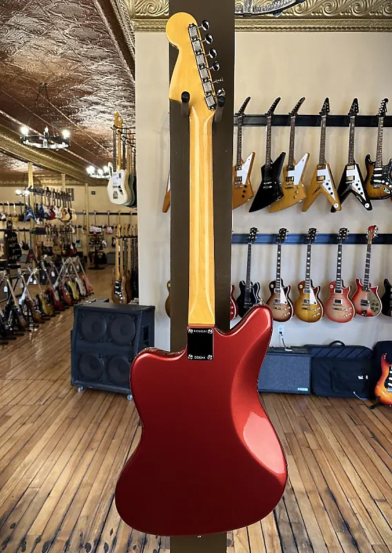 Металлик KO, лаковое покрытие глянцевой нитроцеллюлозой, корпус из ольхи, шейка из клена нестандартной формы, основанная на модели Jaguar 1965 года Джонни, с радиусом грифа 7,25 дюйма, накладкой из розового дерева и ладовыми порожками винтажного размера, длина мензуры 24 дюйма, ширина порожка 1,650 дюйма, специально намотанные звукосниматели Bare Knuckle Johnny Marr для бриджа и грифа, четыре позиции переключателя: позиция 1 - звукосниматель бриджа, позиция 2 - бридж и гриф (параллельно), позиция 3 - гриф, позиция 4 - гриф и хамбакеры моста (в серии), основные регуляторы громкости и тембра, а также два скользящих переключателя (универсальный переключатель яркости; переключатель яркости для положения звукоснимателя 4), мост Jaguar с седлами Mustang и плавающий тремоло-блок в винтажном стиле, колки American Vintage, 3,95 кг, с жестким футляром