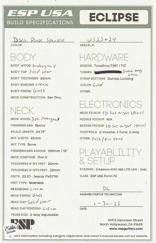 Мы выбрали лучшие доступные компоненты для USA Eclipse, включая колки Sperzel Trim-Lok, фиксирующий бридж и хвостовую часть TonePros TOM, замки для ремня Dunlop и кость для верхнего порожка. Звукосниматели для USA Eclipse включают ассортимент мирового класса от Seymour Duncan. (пассивные) и EMG (активные) модели, с управлением push-pull на ручке тембра для моделей с пассивными звукоснимателями. USA Eclipse поставляется с высококачественным жестким футляром ESP USA, идеально подогнанным по форме.