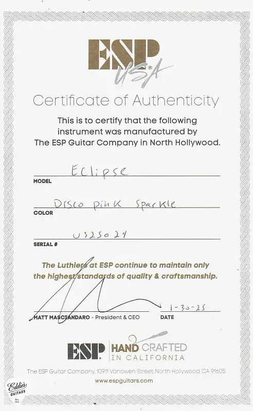 Созданная на нашем предприятии ESP USA в Южной Калифорнии, USA Eclipse обладает классической формой с одной выемкой, которая стала центральной в многих великих музыкальных моментах. USA Eclipse имеет полную толщину (60 мм / 2 3/8”), стратегически камерованное тело из махагони для уменьшения веса, с опциональными верхними панелями из кленового флейма и клена с рисунком и широким выбором глянцевых и сатиновых полупрозрачных покрытий, чтобы подчеркнуть рисунок древесины (и однотонные кленовые крышки для одноцветных покрытий). Эти гитары предлагают плавную конструкцию set-thru на классическом масштабе 24,75 дюйма, с трехсекционным тонким U-образным грифом из махагони и накладкой из черного дерева с 22 сверхбольшими ладами Jescar из нержавеющей стали и вставками из перламутра в виде разделенных флагов.