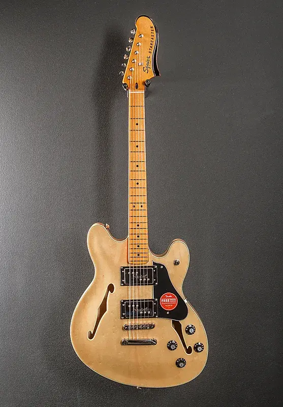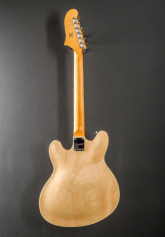 Естественное, изготовлено в Индонезии, глянцевое полиуретановое покрытие, полугитарный ламинированный корпус из клена с центральным брусом, кленовая шея формы С с радиусом грифа 9,5 дюйма и кленовой накладкой с узкими высокие порожки, длина мензуры 25,5", ширина верхнего порожка 1,650", хамбакеры Fender Wide Range на бридже и грифе, 3-позиционный тумблер с регуляторами громкости и тембра для каждого звукоснимателя, бридж и хвостовик стиля Tune-o-matic, колки винтажного стиля, вес 7,6 фунтов, чехол не включен
