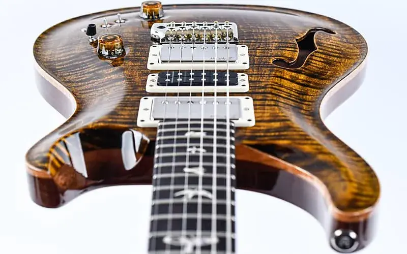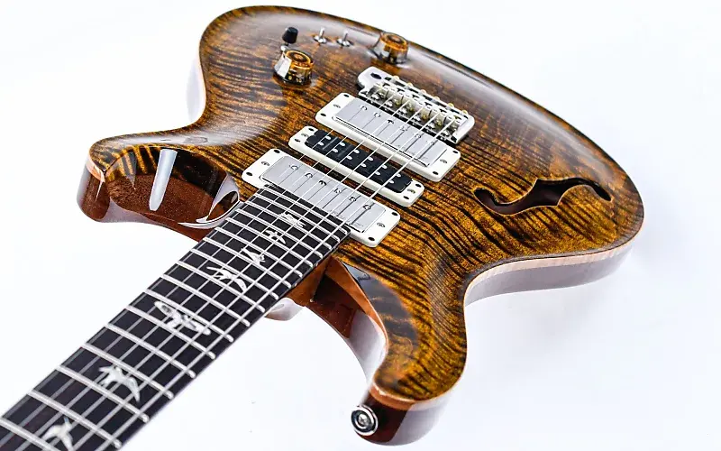 Полуполая конструкция корпуса с одним f-образным отверстием придает звучанию воздушную глубину и резонанс. Конструкция включает в себя топ из пламенного клена, заднюю часть из красного дерева и гриф из красного дерева с 25-дюймовой шкалой и грифом из палисандра с инкрустациями в виде жемчужных птиц. Другие примечательные особенности включают в себя блокировку тюнеров Phase III с кнопками крыла и запатентованную систему тремоло PRS Gen III, которая обеспечивает стабильность настройки и плавную работу.