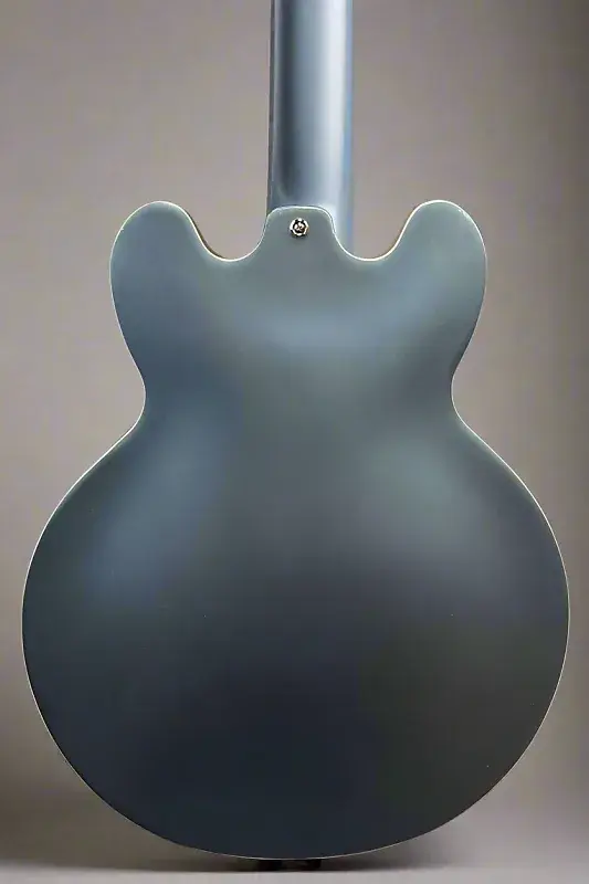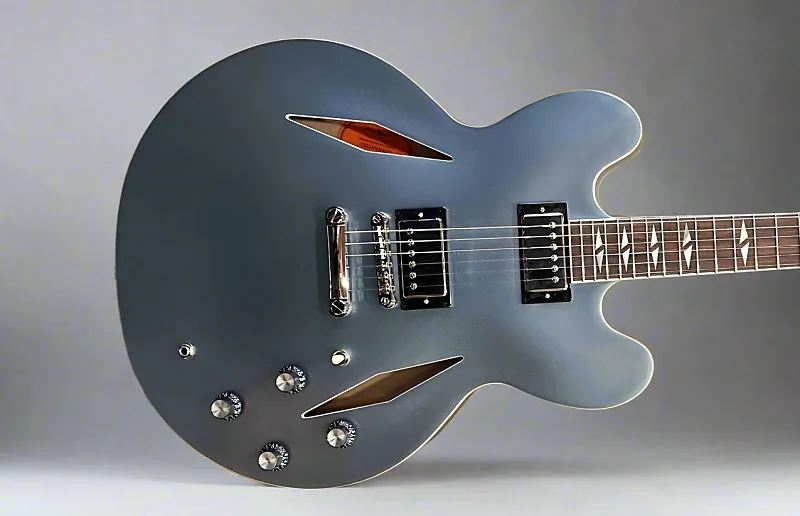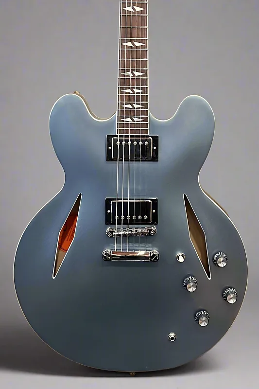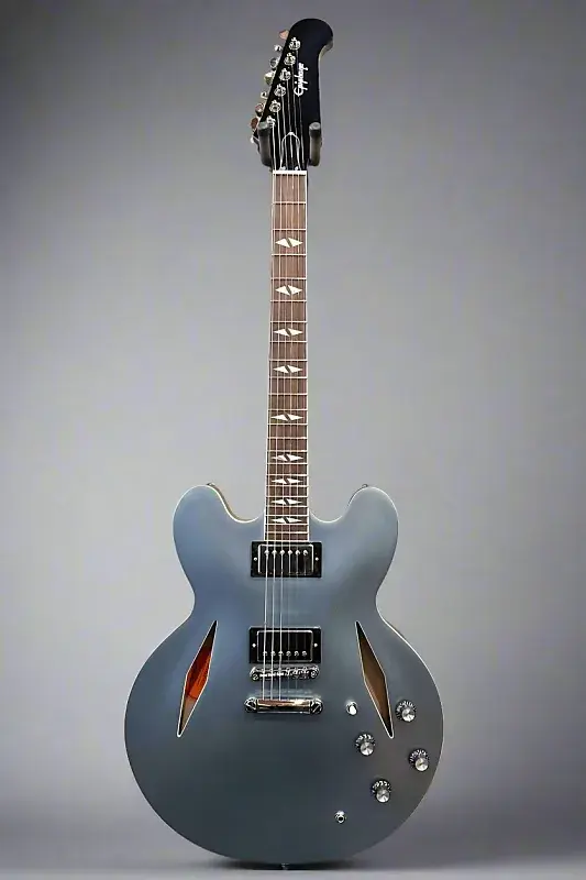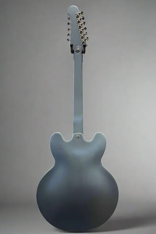 Цвет Pelham Blue, полузакрытый корпус из слоя клена и тополя с центральным блоком из клена, гриф из махагони в форме эллиптической C, грифовая накладка из индийского лавра с окантовкой, инкрустация Mother of Pearl Split Diamond и средние джамбо ладовые порожки, длина мензуры 24,75”, ширина верхнего порожка 1,69”, бридж Gibson USA Burstbucker #3 и звукосниматель Gibson USA Burstbucker #2 на грифе, переключение на 3 позиции с регуляторами громкости и тона для каждого звукоснимателя, тремоло-мост Epiphone LockTone tune-o-matic и остановочный стержень, колки Grover Mini Rotomatic, вес 7,2 фунта, с жестким кейсом