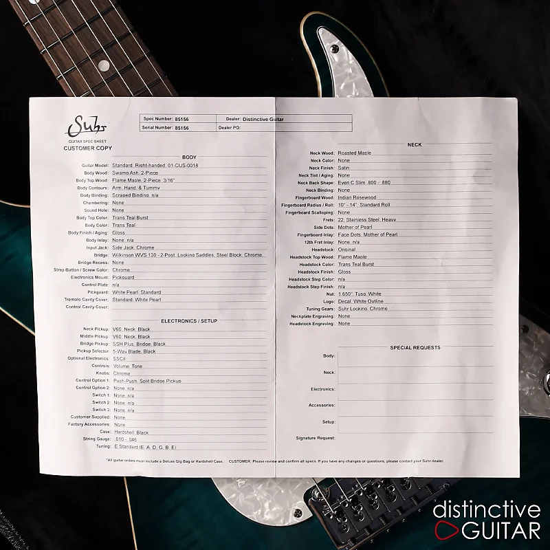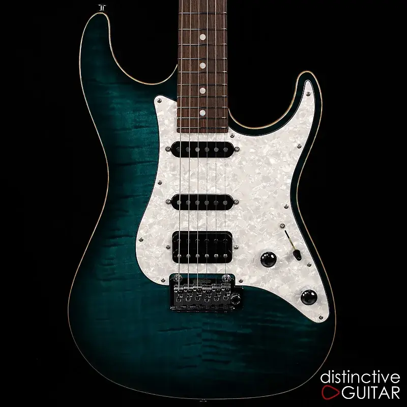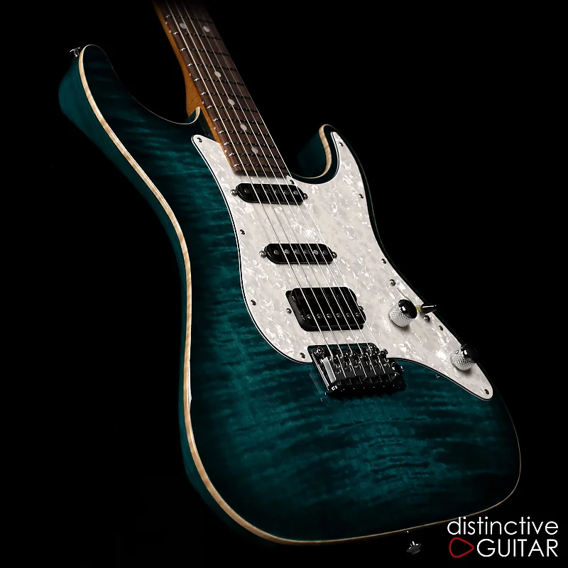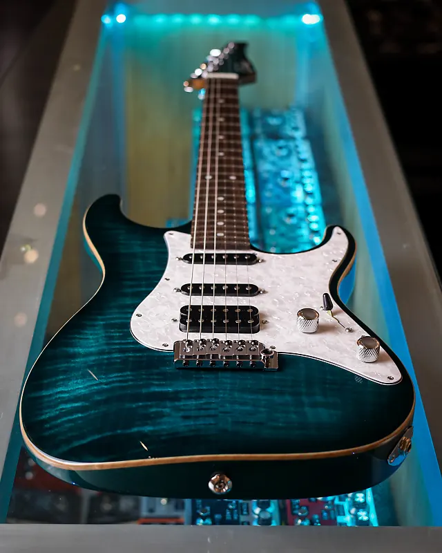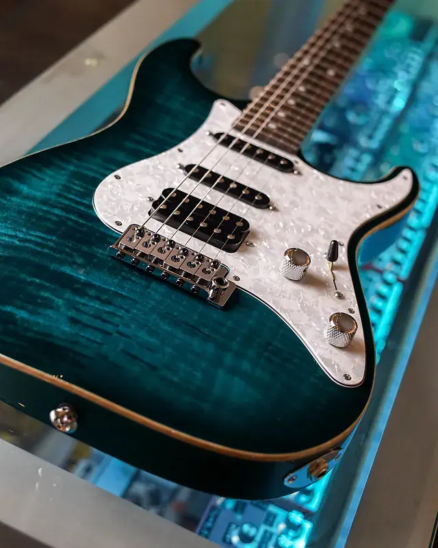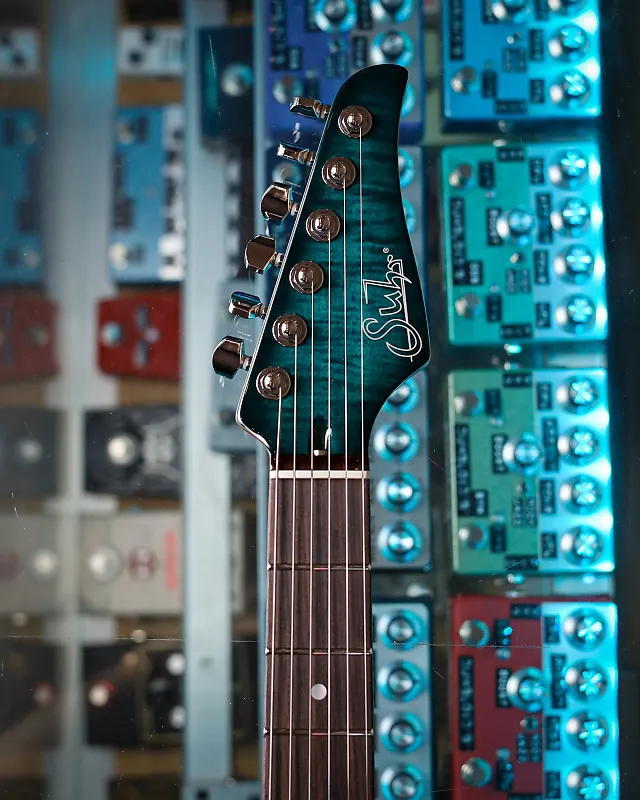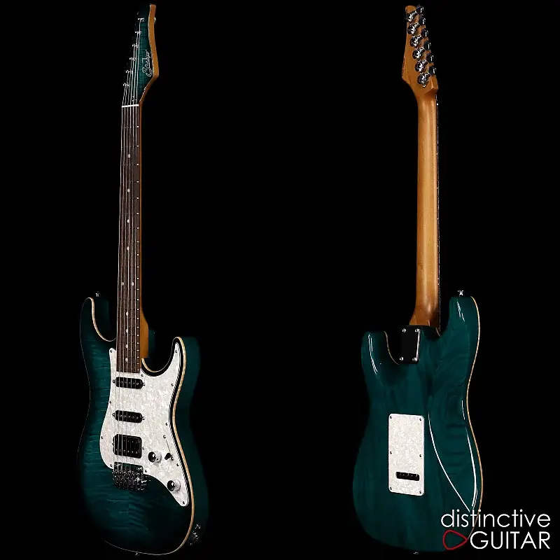 Эта Suhr Standard Custom в цвете Trans Teal Burst - настоящая находка для ценителей музыки, демонстрирующая эффектную крышку из Flame Maple с элегантной обработанной окантовкой. Корпус из Swamp Ash в сочетании с грифом из Roasted Maple и накладкой из Rosewood обеспечивает шелковистое ощущение игры и премиальное впечатление от инструмента в целом.