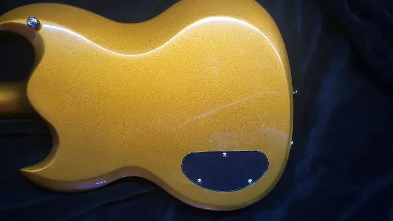 Корпус: Сплошной махагон с потрясающим металлическим золотым покрытием и ровной верхней панелью.