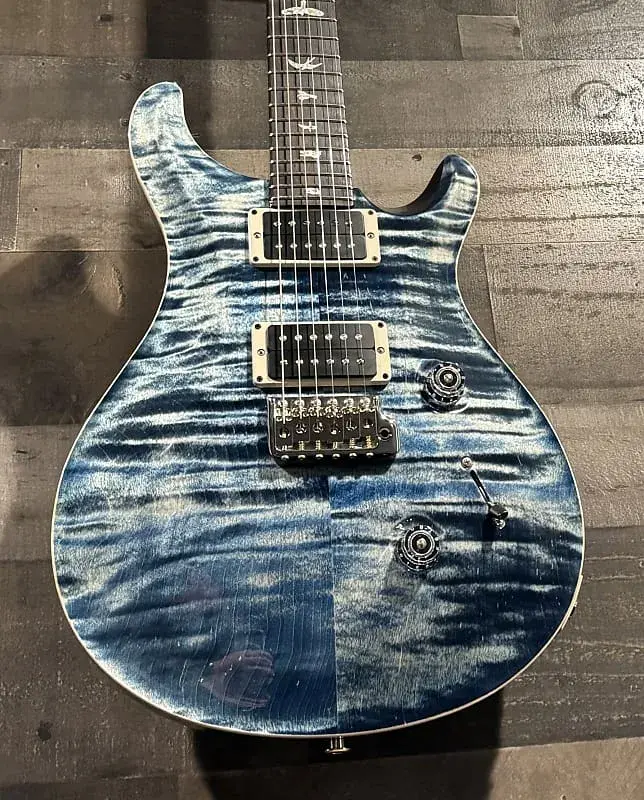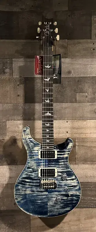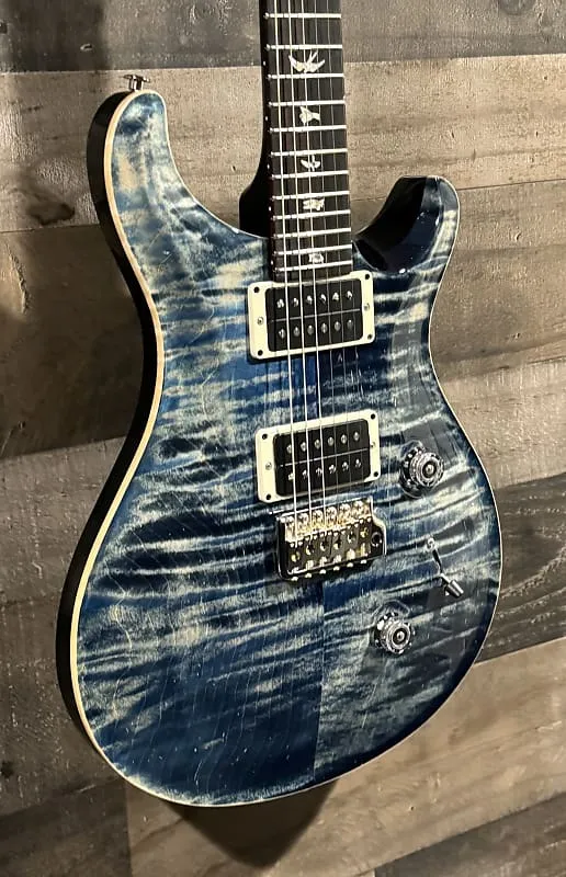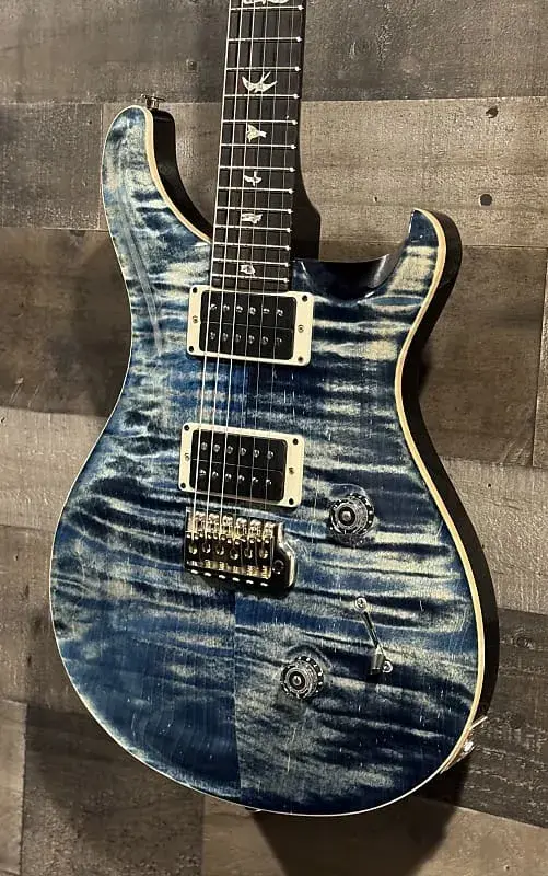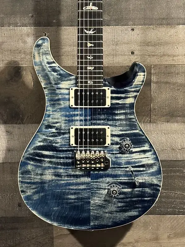 Здесь у нас прекрасный PRS Custom 24 в цвете Faded Whale Blue с потрясающей фигурной кленовой декой, весом всего 7 фунтов 6 унций!