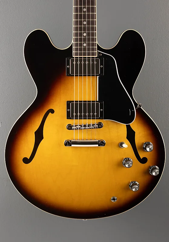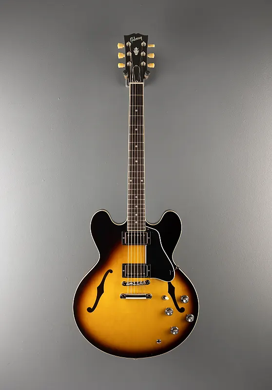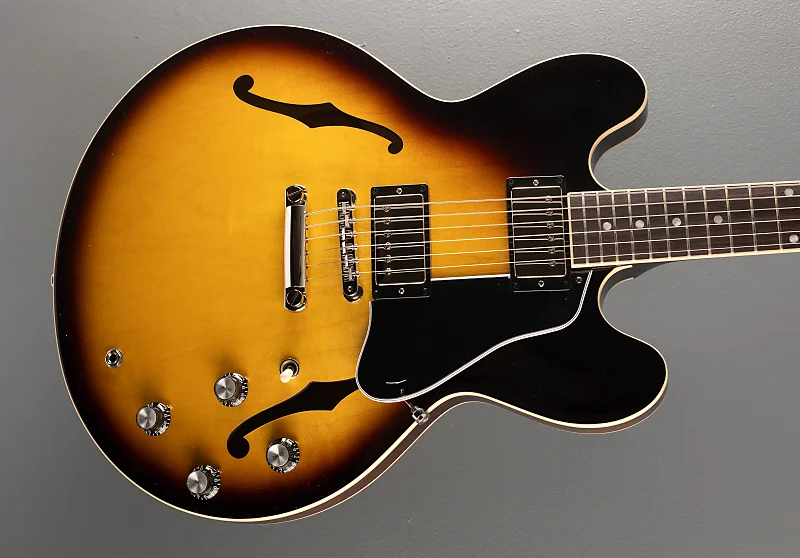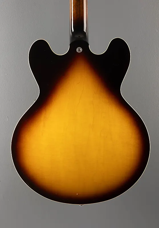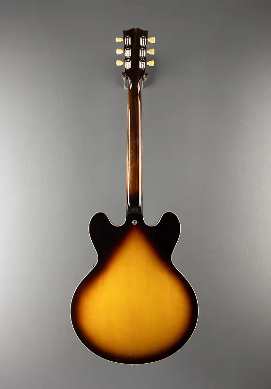 Отделка Vintage Burst с глянцевым нитроцеллюлозным лаком, полуакустическое тело из трех слоев клена/тополя/клена с центральным блоком из клена, гриф из красного дерева формы Rounded C, накладка на гриф из розового дерева с радиусом 12 дюймов с акриловыми точками и ладами среднего размера, длина мензуры 24,75", ширина верхнего порожка 1,7". Калиброванные датчики типа T-Type для моста и neck-ритма, 3-позиционный переключатель с регуляторами громкости и тембра для каждого датчика, Струнодержатель ABR-1 tune-o-matic и алюминиевый задний фиксатор, тюнеры Gibson vintage deluxe с кнопками Keystone, 7,5 фунтов, в жестком кейсе