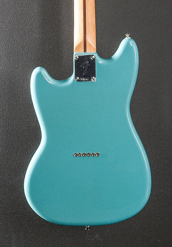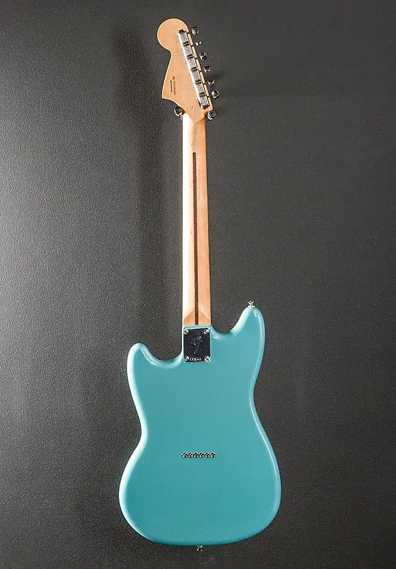 •Aquatone Blue, Сделано в Мексике, глянцевая полиэстеровая отделка корпуса, корпус из ольхи, современный C-образный кленовый гриф с пластиной радиуса 9,5 дюйма из палисандра и средними джамбо-ладами, длина мензуры 24 дюйма, ширина порожка 1,650 дюйма, однокатушечный бридж и нековые звукосниматели серии Player Alnico 5 Mustang, 3-позиционное переключение с регуляторами общей громкости и тембра, Струнный корпус хардтейл бридж Strat с изогнутыми стальными седлами, тюнеры Fender ClassicGear, 7,2 фунта, чехол в комплект не входит