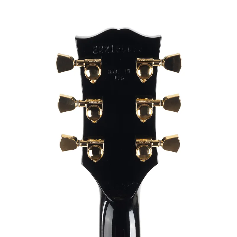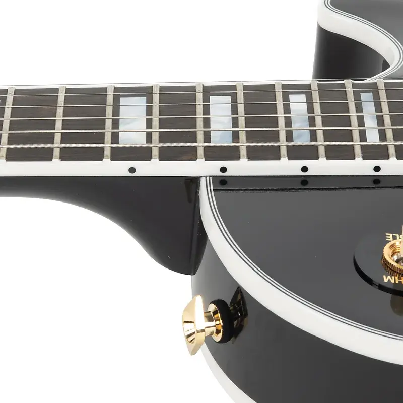 Конструкция полностью соответствует классу Custom: цельное тело из махагони с трехслойной кленовой накладкой, отделанное глубоким черным цветом и обрамленное многоярусной окантовкой. Кленовая шея имеет характерный профиль 70-х с вольютой, обеспечивая устойчивый и привычный хват. Ее венчает окантованная эбеновая накладка на грифе с перламутровыми инкрустациями в виде блоков и оснащенная 22 средне-джамбо ладами для ощущения, которое одновременно скользкое и ощутимое под пальцами.