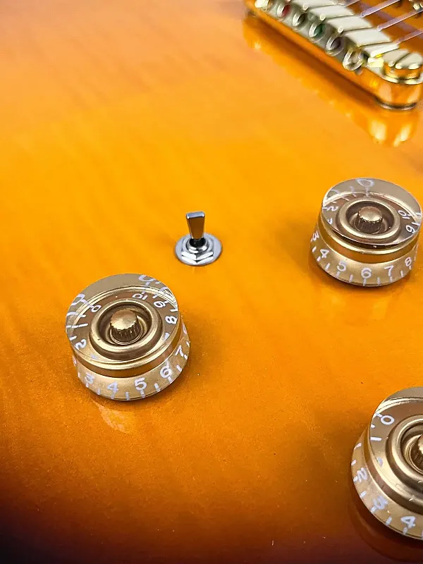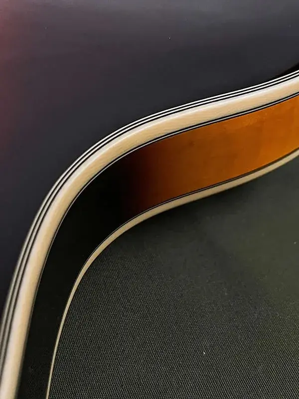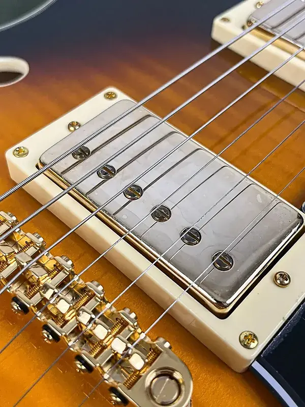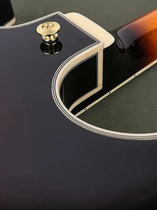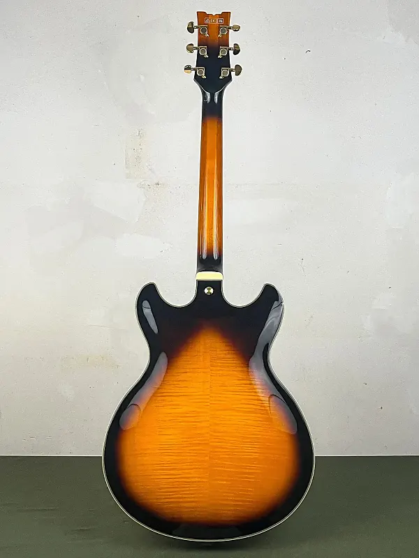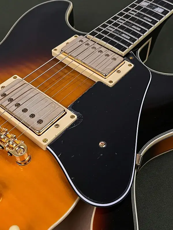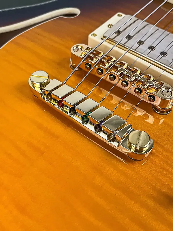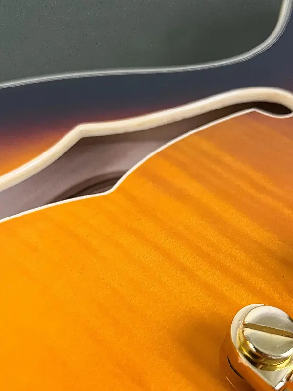 Этот полуакустический инструмент оснащен тщательно обработанным корпусом из кленового дерева с фактурой «флейм мэйпл» и винтажным желто-солнечным градиентом, излучающим классическую элегантность.