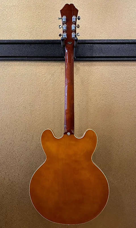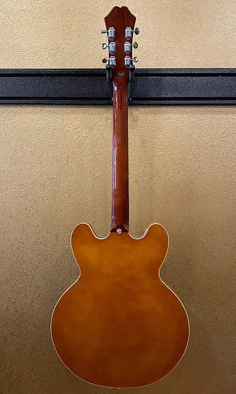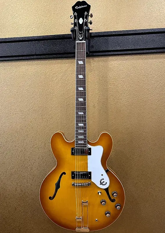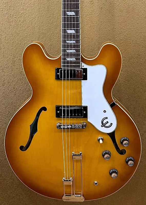 Royal Tan, полуакустический корпус из многослойного клена с кленовой центральный блок, гриф из красного дерева с закругленной формой C, грифовая накладка из индийского лауреля с радиусом 12” с окантовкой, с инкрустацией из искусственного перламутра в виде трапеций и ладами среднего размера, длина мензуры 24,72”, ширина верхнего порожка 1,69”, бридж Epiphone Pro Mini Humbucker T и хамбакеры Epiphone Pro Mini Humbucker R на грифе, 3-позиционный переключатель с регуляторами громкости и тона для каждого звукоснимателя, бридж Epiphone LockTone tune-o-matic и хвостовик Frequensator, колки Epiphone vintage deluxe, чехол не входит в комплект.
