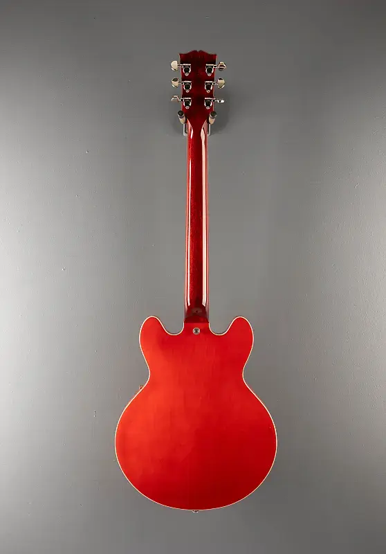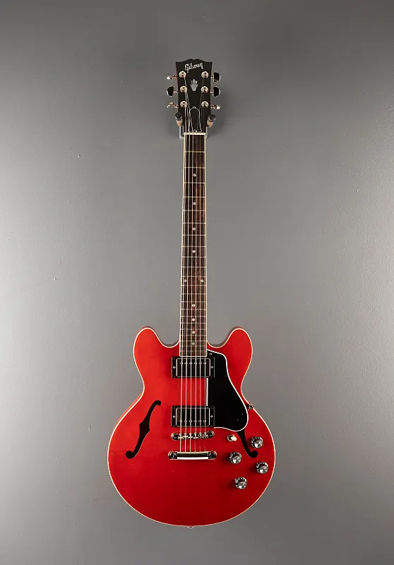 Cherry, блестящее покрытие из нитроцеллюлозного лака, полузакрытый корпус из трех слоев клена/тополя/клена с кленовым центральным блоком, гриф из махагони формы Rounded C, накладка из розового дерева с радиусом 12 дюймов и ладами medium jumbo, длина мензуры 24,75 дюйма, ширина верхнего порожка 1,69 дюйма, хамбакеры Gibson '57 Classic Plus и '57 Classic на грифе»