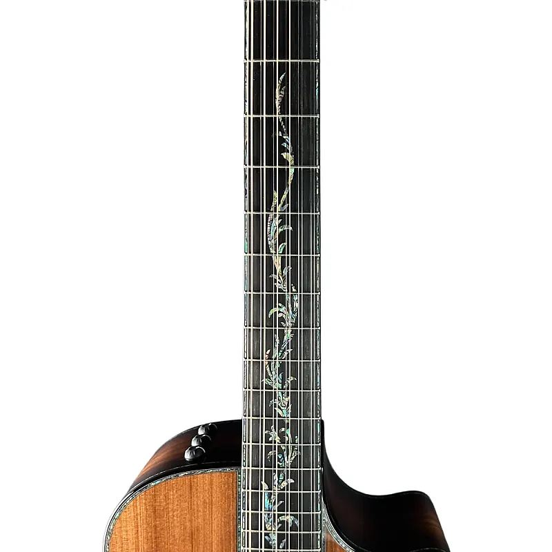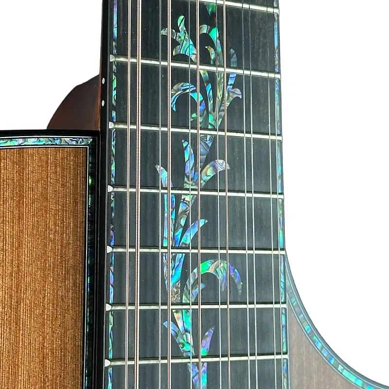 Обводка Paua и вставки Koa: впечатляющие деталей с блестками, окружающие корпус, розетку и гриф.
