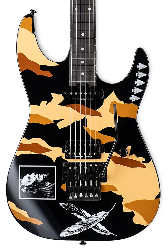 ESP LTD GL Desert Eagle - это современная интерпретация легендарной модели Kamikaze Джорджа Линча, одной из самых знаковых сигнатурных гитар ESP. С потрясающей графикой Desert Eagle, эта высокопроизводительная гитара оснащена корпусом из ольхи, креплением шеи на болтах из клена и грифом из эбена Macassar, разработанным для скорости, сустейна и точности.
