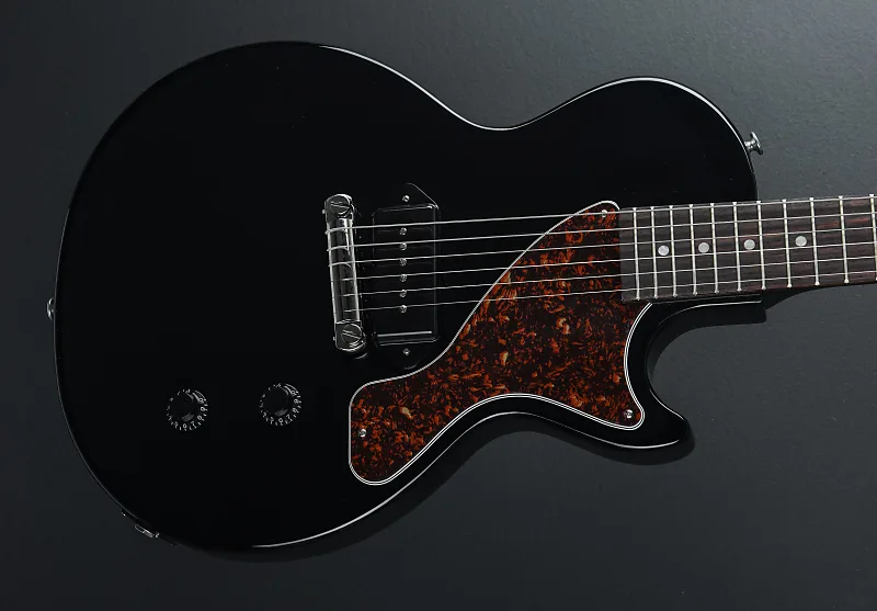 Ebony, глянцевый лак из нитроцеллюлозы, корпус из махагони, гриф из махагони в винтажном стиле 50-х, накладка грифа из палисандра с радиусом 12” и акриловыми точечными инкрустациями и ладовыми порожками среднего размера, масштаб 24,75”, ширина нижнего порожка 1,695”, P-90.