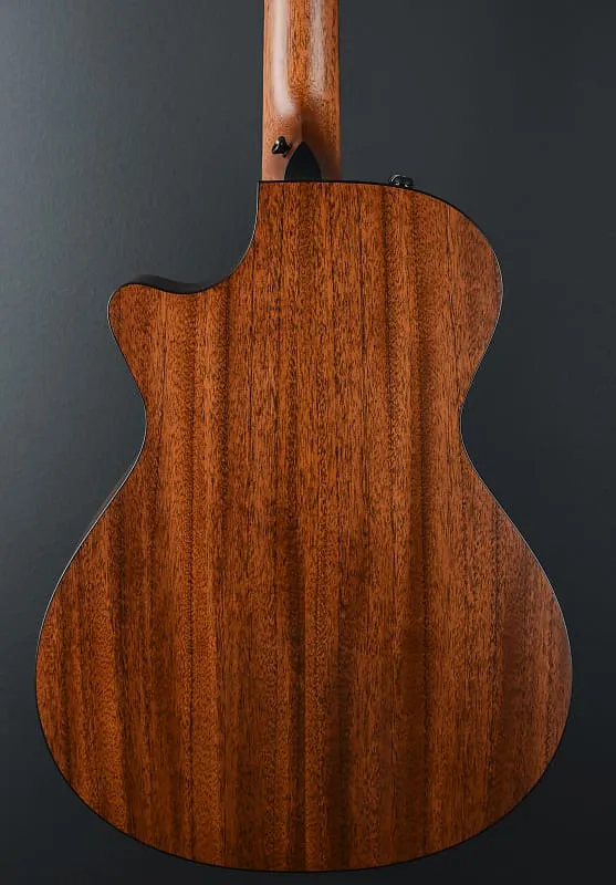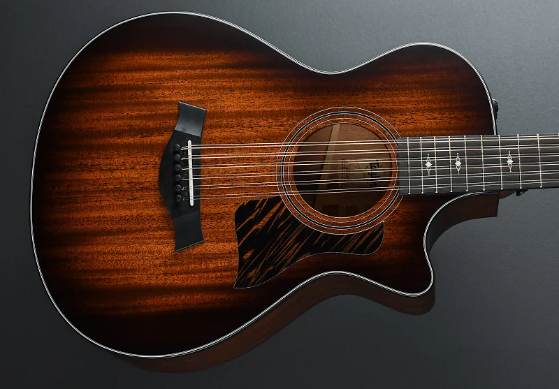 Верх Shaded Edgeburst, форма корпуса Grand Concert с венецианским вырезом, верх из Neo Tropical Mahogany, тройная пластиковая розетка, брамсирование V-Class с Relief Rout, задняя дека и обечайки из Tasmanian Blackwood, черная окантовка, дерево West African Crelicam
