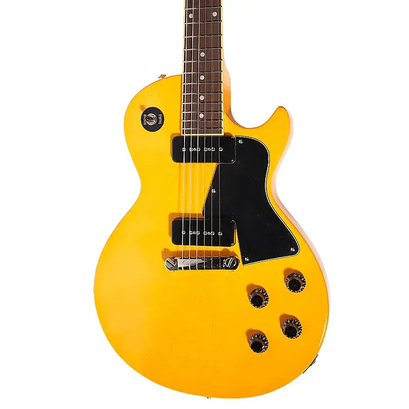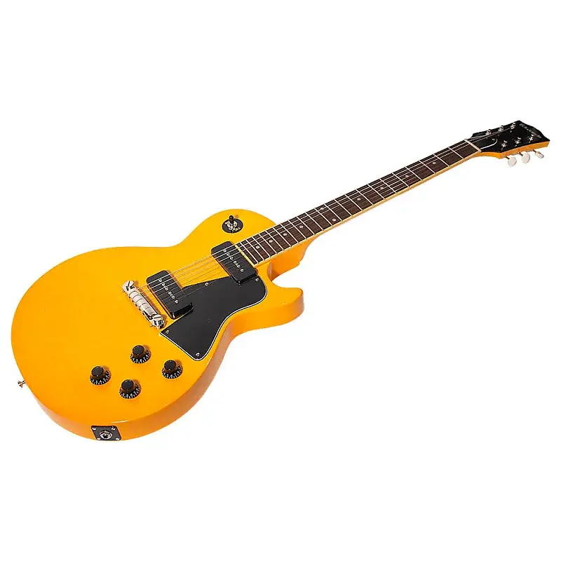 Эта модель имеет сатиновую отделку TV Yellow, никелевую фурнитуру, бридж wraparound, черную накладку и винтажные колки.