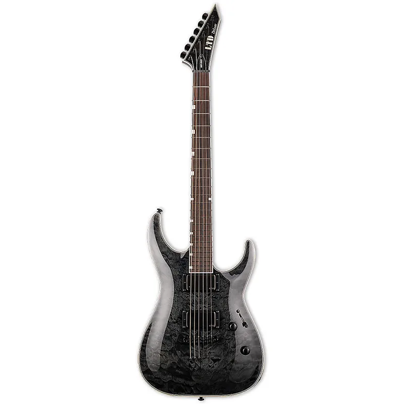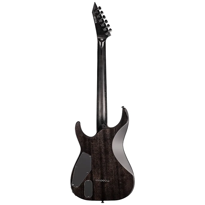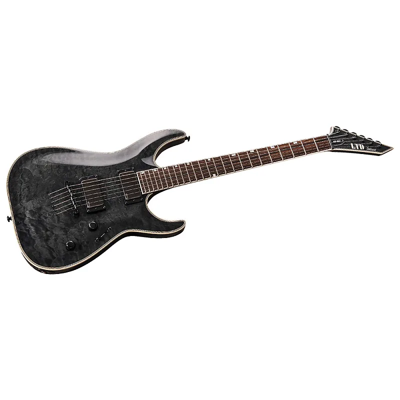 MH-1001NT/STBLK, Высококачественная гитара ESP LTD серии MH, мензура 25,5 дюйма, объединенная шейка из клена, верхняя дека из клена с рисунком, корпус из красного дерева, грифовая накладка из черного эбена, активные хамбакеры EMG Metalworks 85 и 81, мост Tonepros TOM, замковые колки, черная фурнитура, глянцевое покрытие See Thru Black, головка грифа в цвет корпуса