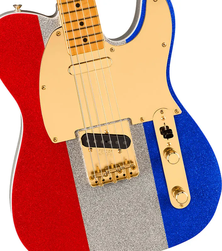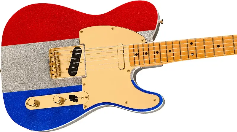 Buck Owens Telecaster имеет корпус из ольхи, выполненный в фирменном красном, серебристом и синем блеске с двойным белым окантовкой, что придает культовый вид кастомных Tele от Buck. Кленовый гриф конца 50-х годов в форме буквы «C» имеет кленовый гриф радиусом 7,25 дюйма с 21 винтажным ладом и соответствующей трехцветной блестящей отделкой грифа. Оснащен кастомными катушками Buck Owens Alnico 3 и Alnico 2 С теле-датчиками эта гитара обеспечивает яркий, пронзительный звук, который определил звучание кантри Бэкерсфилда Бэка. Другие особенности включают блестящую золотую фурнитуру в винтажном стиле, от бриджа с тремя седлами и сквозной установкой струн до рифленых ручек на плоской верхней деке и сияющего золотого зеркального накладного пикап-пласта.