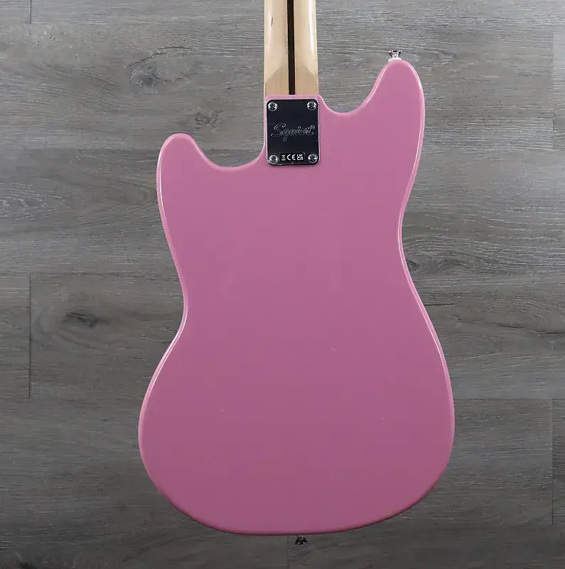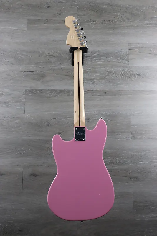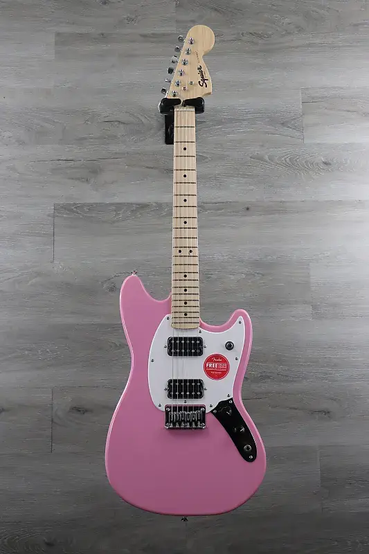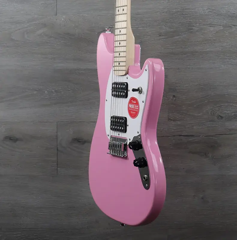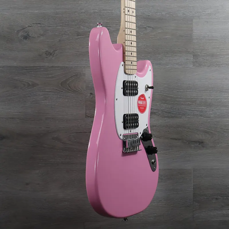ПРЕДМЕТ НА ФОТО: Squier Sonic Mustang HH, клен Гриф, белый накладной пикгард, ярко-розовый цвет