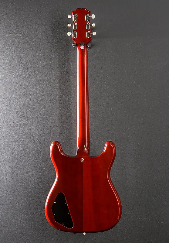 "Crestwood впервые появился в 1958 году, а в 1959 году был переименован в Crestwood Custom; это была первая электрогитара с твердым корпусом и двумя звукоснимателями от Epiphone. Новая Epiphone Crestwood Custom возвращается к своим истокам с характеристиками, которые напоминают о ранних моделях, включая симметричный корпус из красного дерева с двойным вырезом, два звукоснимателя Epiphone PRO Mini Humbucker, уменьшенную головку грифа на три струны с логотипом Epiphone Bikini и колки Epiphone Deluxe с слоновой костью, а также прозрачный pickguard в форме бабочки с белой центральной полосой и фольгированным логотипом E. Crestwood Custom оснащена вклеенным грифом из красного дерева со средним профилем C, грифовой накладкой из индийского лавра с радиусом 12", 22 средне-джамбо ладом и овалами Epiphone, 2 регуляторами громкости и 2 регуляторами тембра с потенциометрами CTS, и мостом Epiphone LockTone Tune-O-Matic с седлами Graph Tech TUSQ и вибрато Tremotone."