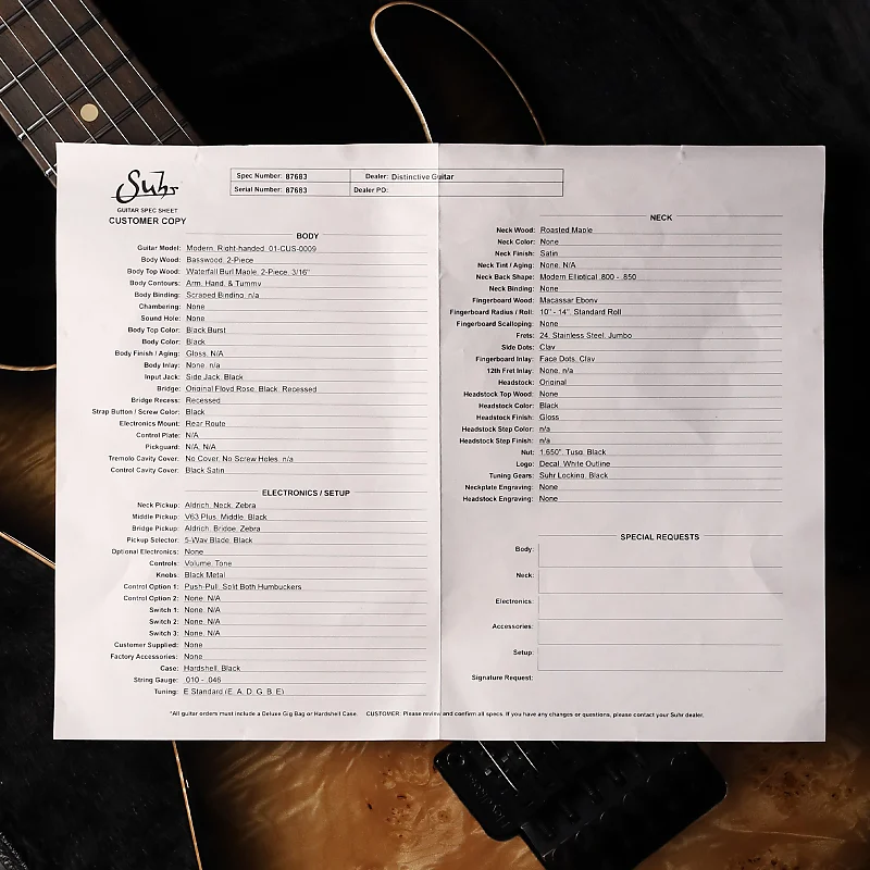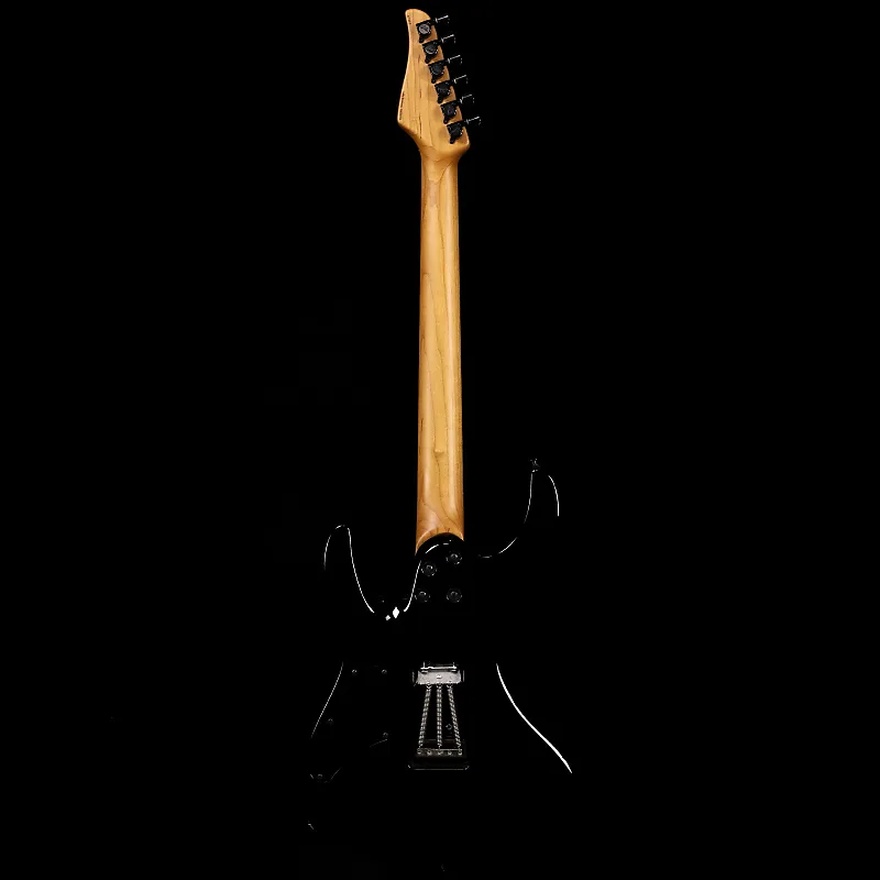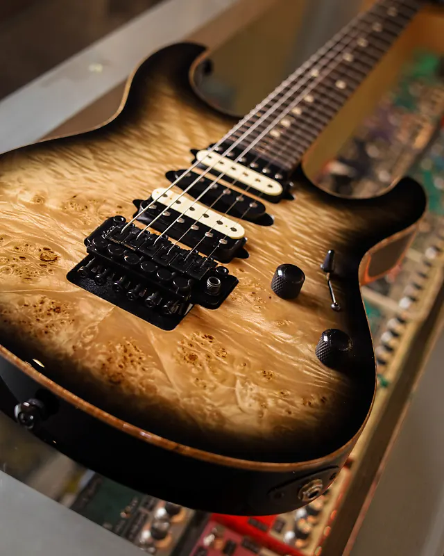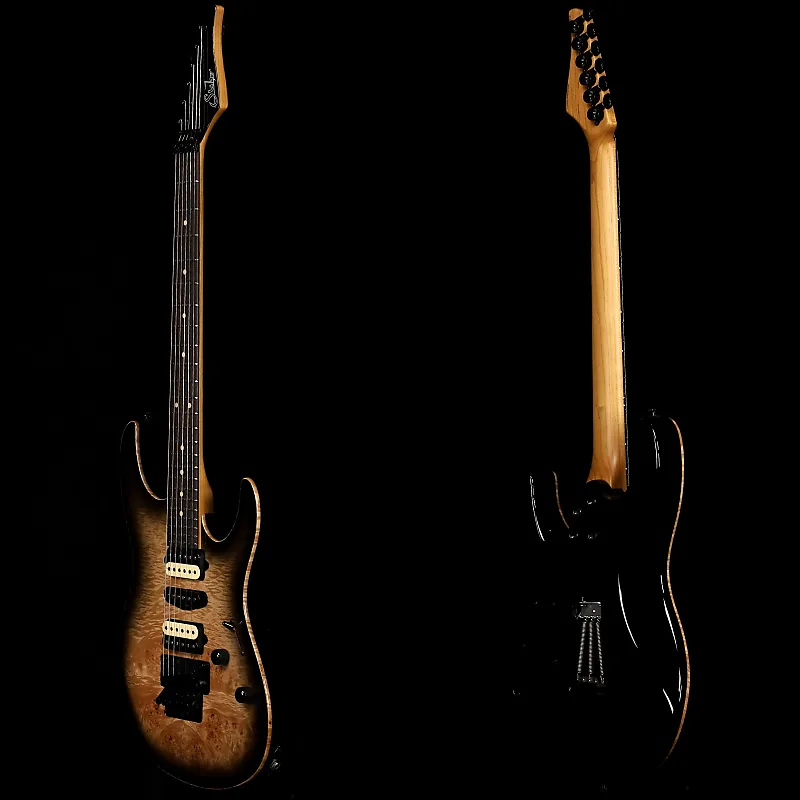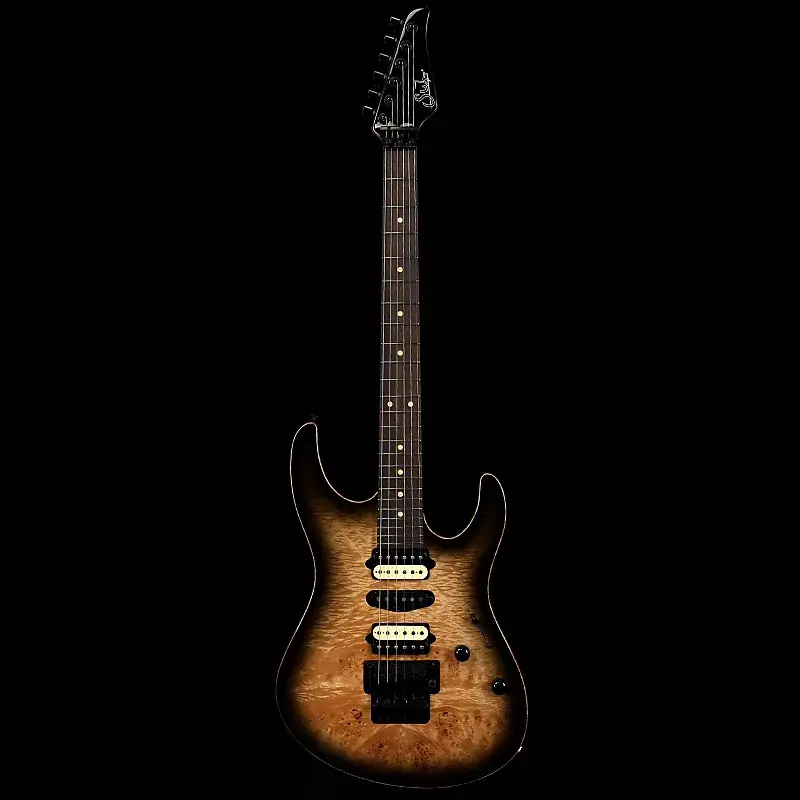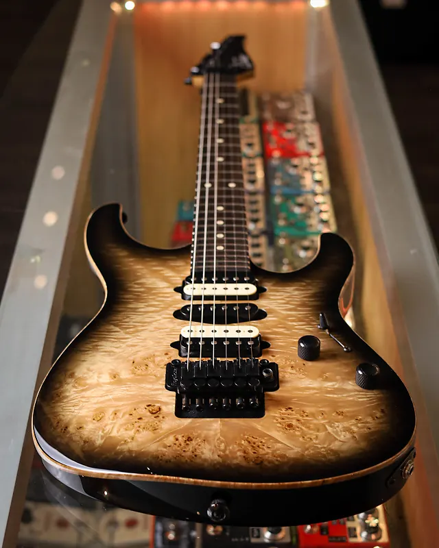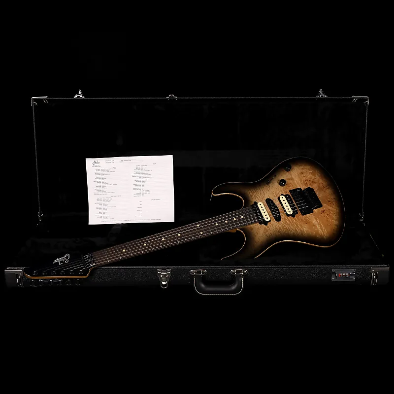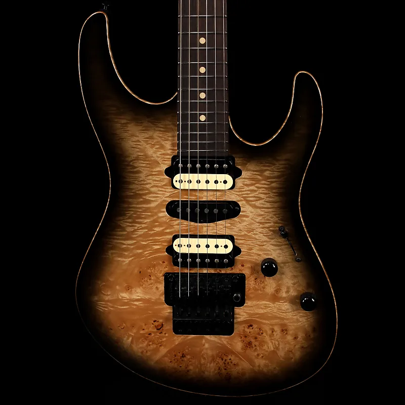 Гитары Suhr Custom - это воплощение качества и внимания к деталям. Модель Modern разработана для профессиональных музыкантов с эргономичной формой и продуманным подбором древесины и электроники. Начнем с грифа из Roasted Maple и накладки из Macassar Ebony. Форма Modern Elliptical обеспечивает быструю и удобную игру, а сатиновое покрытие легко скользит под рукой. Верхняя дека Waterfall Burl Maple с покрытием Black Burst добавляет эстетики, подчеркивая глубину древесины, которая сияет на свету. Скреп-биндинг демонстрирует красоту клена и гармонично объединяет все элементы. С конфигурацией HSH и 5-позиционным переключателем струнных партий у вас не будет недостатка в тембрах. Нельзя не упомянуть о трио звукоснимателей Aldrich + V63 Plus. Они звучат мощно и одновременно сфокусировано, с ярким звучанием в средних частотах и четким низким диапазоном. Вы никогда не услышите, чтобы эти звукосниматели звучали мутно или нечетко на высоких уровнях перегруза. Высокие средние частоты прорезают звук словно самый острый нож, а верхние частоты остаются сладкими и никогда не режут слух. И если вы захотите разделить оба Хамбакеры, не стесняйтесь использовать кнопку Push/Pull для получения ультимативных высокоэффективных звукоснимателей, идеально подходящих для агрессивного рок-стиля игры.