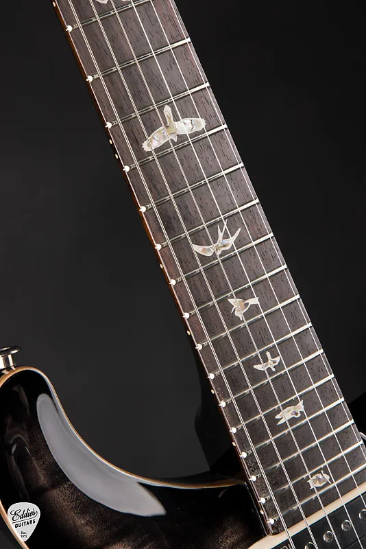 Корпус выполнен с резным фигурным кленовым верхом, красиво отделанным в цвете Charcoal Burst - смелый и визуально динамичный градиент, подчеркивающий глубину и движение кленового рисунка. Задняя часть корпуса сделана из цельного махагонового дерева, обеспечивая теплую, резонансную тональную основу с богатым откликом в среднем диапазоне. Вместе эти древесные материалы формируют классическое сочетание PRS: прозрачность, сустейн и гармоническая сложность.