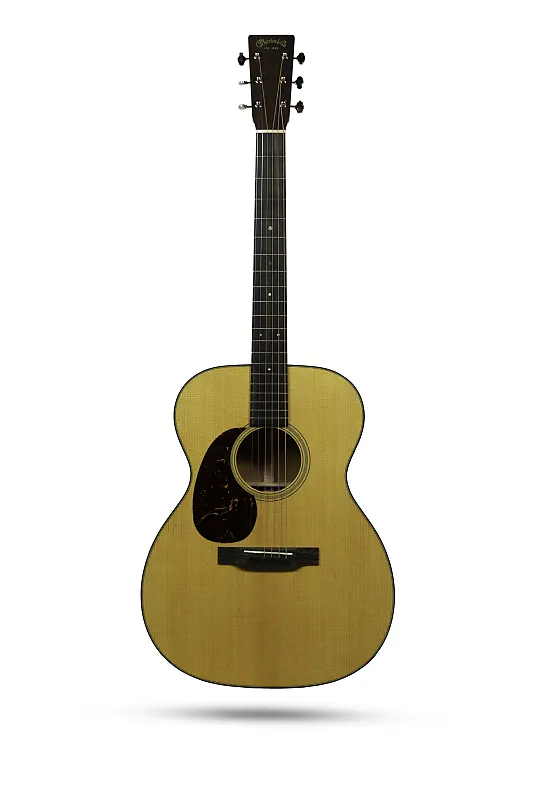 Левая 000-18 Standard с задней частью и обечайками из махагони, верхняя дека из ели ситка, узкий конический профиль грифа и накладка грифа и мост из черного дерева.