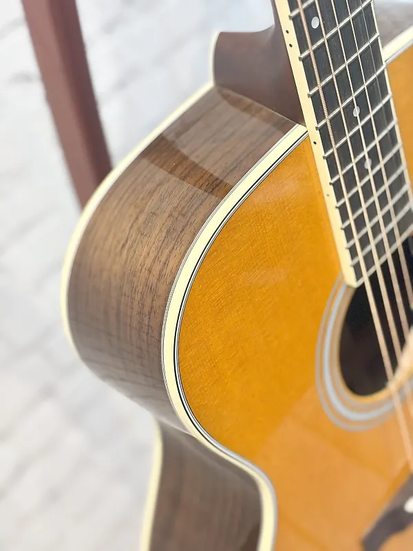 Задняя часть из трех частей, связанный гриф и корпус, широкий, как джамбо, и тонкий, как 000, для звука, столь же характерного, как у тех, кто на нем играет. Восточно-индийский палисандр и ель работают с зубчатыми распорками, чтобы создать большой, сбалансированный тон, идеально подходящий для студийных записей. Закрытые тюнеры и модифицированный низкий овальный гриф с узким конусом обеспечивают превосходные игровые удобства.