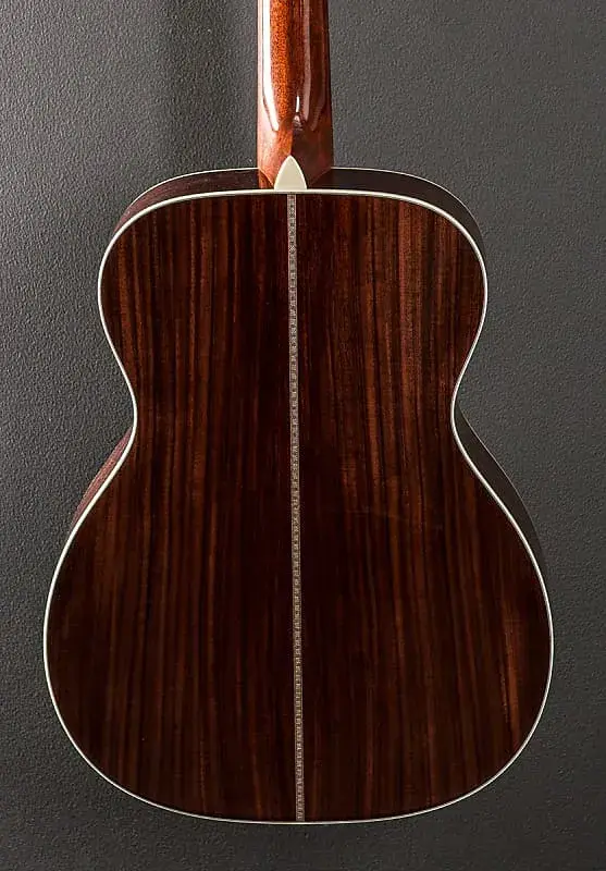 Верх «Sunburst 1935», корпус 000-14 ладов, цельный Верх из ели Ситка, рифленая X-опора, тонкая елочка с многоцветной розеткой, цельная индийская розовое дерево на спинке и боках, зигзагообразная окантовка спинки, окрашенная связка Ivoroid с тонкой елочкой на вставке верха, гриф из черного дерева с длинными инкрустациями из перламутра в виде ромбов и квадратов и инкрустация подписи Awabi Clapton на модифицированном грифе V с стандартным коническим кленовым грифом, длина мензуры 24,9 дюйма, ширина порожка 1 3/4 дюйма, с жестким футляром
