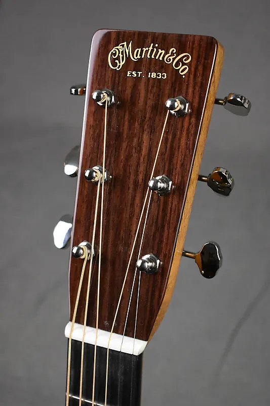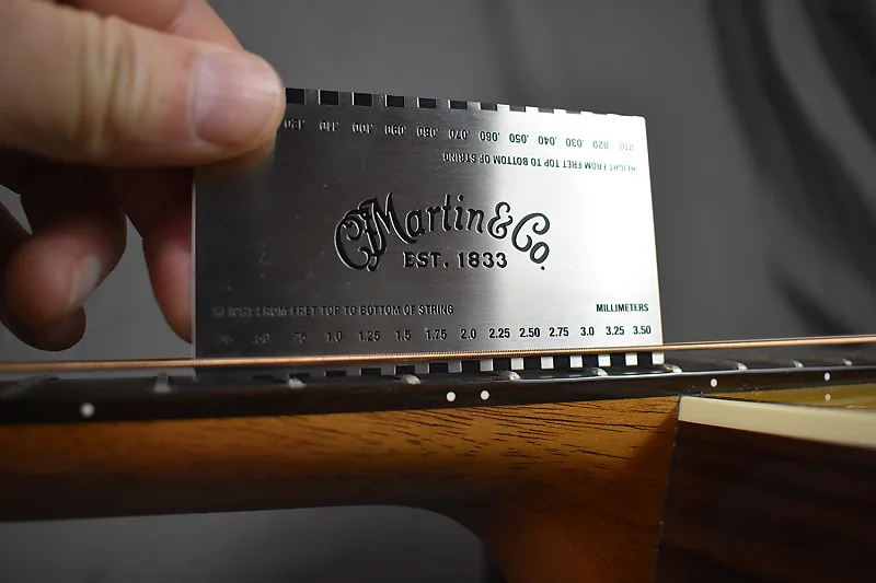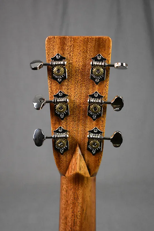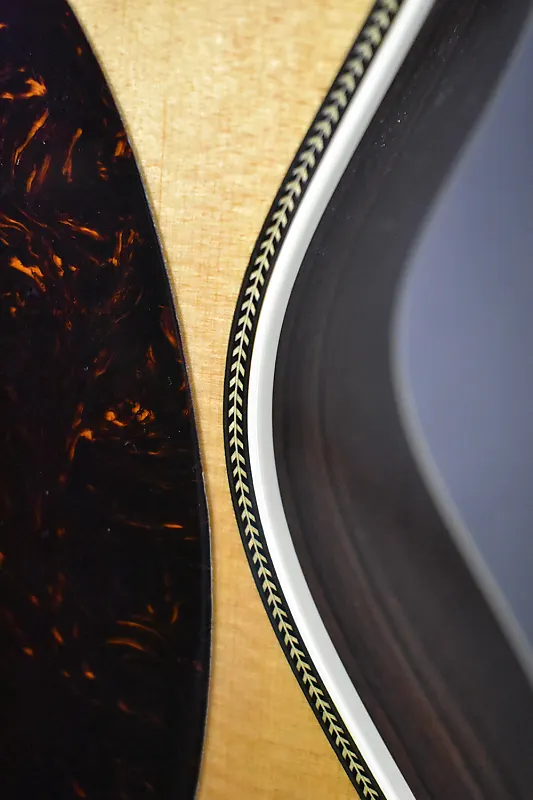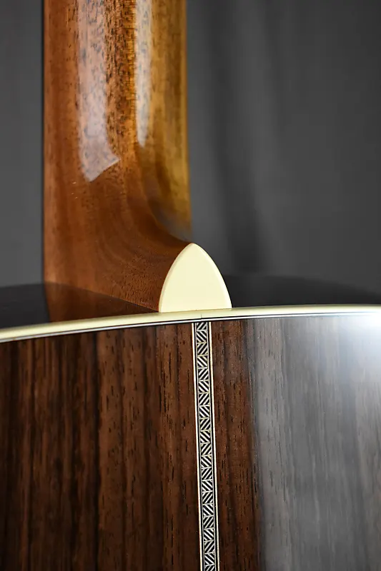 Визуально модель 30th Anniversary демонстрирует изысканные отсылки к довоенной эстетике Martin: на головой колковой части есть наклейка с надписью "C.F. Martin & Co", соответствующая 1930-м годам, а инкрустации в виде снежинок Golden Era Style-42 выглядят великолепно на неокантованной накладке из черного дерева. Верхняя дека обрамлена тонкой елочной окантовкой, которая гармонирует с элегантной розеткой в том же стиле. Что касается ощущений при игре, 000-EC оснащена модифицированной V-образной грифовой шейкой, уменьшенной до более удобной ширины верхнего порожка 1-11/16 дюйма, обеспечивая современный комфорт игры и при этом сохраняя винтажное ощущение.