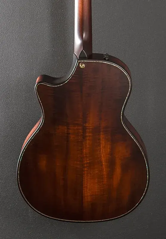 Отделка Silent Satin Natural с задней и боковыми деками в цвете Kona Burst, форма корпуса Grand Auditorium с скошенным вырезом и подлокотником, топ из термически обработанной ели Ситка, одна розетка из коки/волокна/пауа, распорка V-Class с Relief Rout, задняя и боковые дека из гавайского коки, Вест