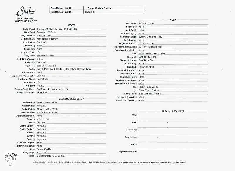 Весом 7 фунтов 14 унций, Suhr Classic JM хорошо сбалансирован как для сцены, так и для студийного использования. Он поставляется в защитном чехле Suhr Deluxe Gigbag, готовый вдохновлять вас везде, куда бы вы его ни взяли. Благодаря своей впечатляющей эстетике, мощному тону и легкости в игре, Classic JM в цвете Tangerine Freeze является настоящей современной классикой, созданной для музыкантов, которые не готовы идти на компромиссы.