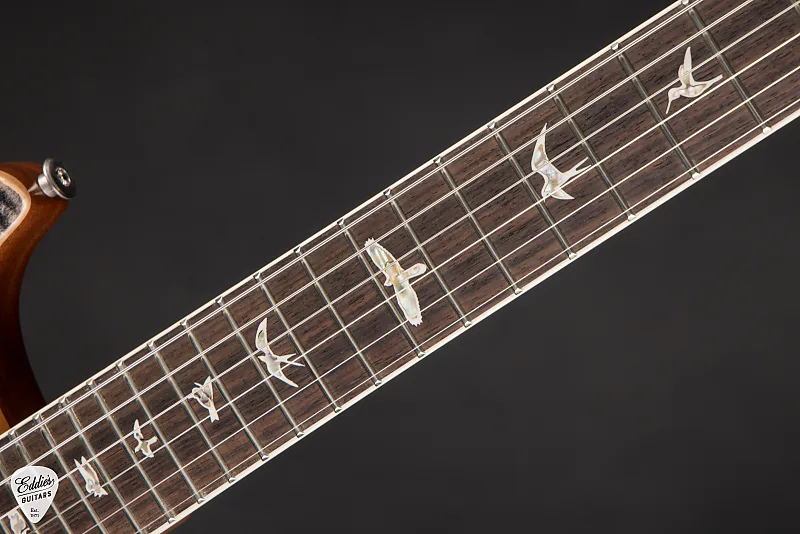 Цельный гриф из махагони, соединенный с корпусом с помощью ультра-устойчивой конструкции PRS set neck, имеет удобный профиль Santana Retro - дань уважения оригинальным гитарам PRS до фабричного периода Сантаны. С длиной мензуры 24,594", 24 ладами и грифом из палисандра с радиусом 10", гитара обеспечивает легкий доступ по всей грифовой доске и плавное, естественное ощущение игры. Тончайшие детали, такие как глубина грифа 7/8" на ½ ладу и 31/32" на 12½ ладу, обеспечивают сбалансированный и знакомый хват, а ширина порожка 1 11/16" и ширина у корпуса 2 1/4" предоставляют достаточно места для выразительных изгибов и сложной фразировки. Гриф украшен фирменными накладками в виде птиц от PRS, и Головка грифа гордо несет логотип Орла, символ элитного мастерства.