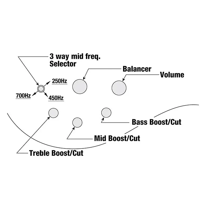 3-позиционный переключатель средних частот позволяет музыкантам изменять средние тона между 250, 450 и 700 Гц.
