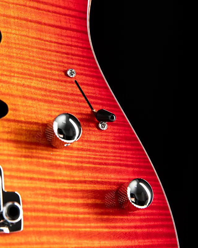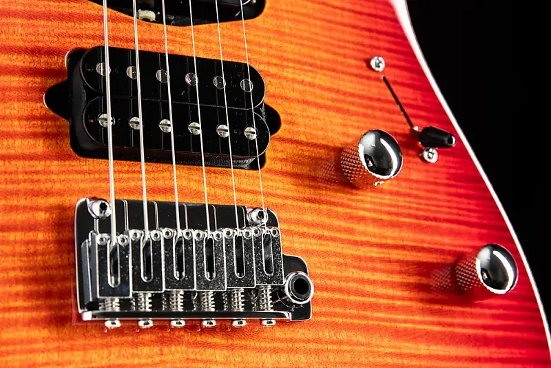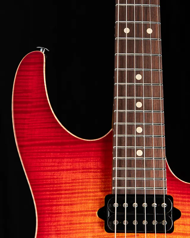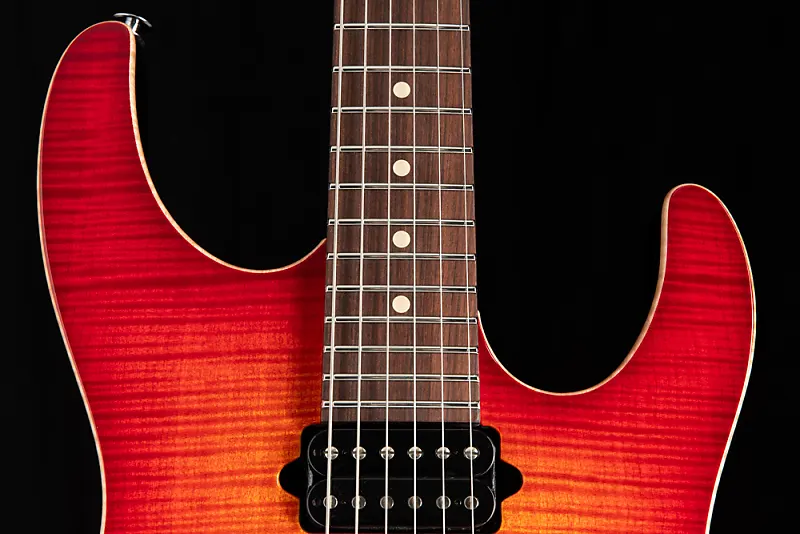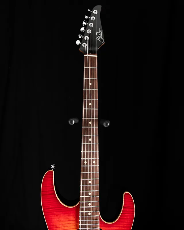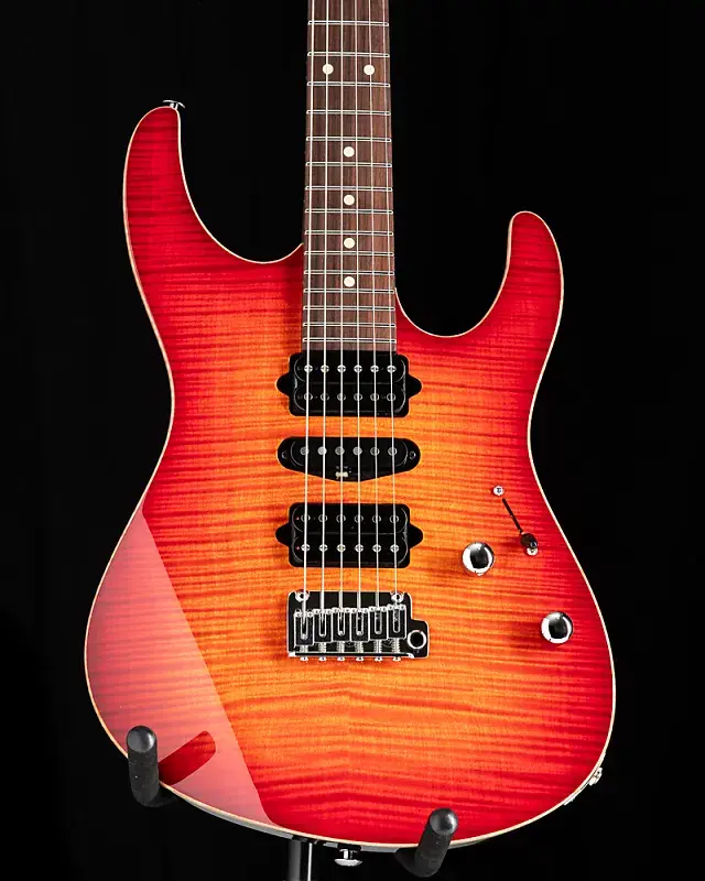 Suhr Modern Plus Fireburst Серийный номер: 74494 Вес: 7,7 фунта. Форма корпуса: Modern Материал корпуса: Леска (Basswood) Верх корпуса: Клен с рисунком Flame Maple Окантовка: Стертая Материал грифа: Жареный клен Накладка на гриф: Pau Ferro Форма задней части грифа: Modern Elliptical .800"-.850" Радиус грифа: Compound 10"-14" Лады: Джамбо из нержавеющей стали (.057"x.110") Гриф: Tusq 1,650" Сэрунт мостовой звукосниматель: SSH+ (черный) Средний звукосниматель: V60LP (черный) Грифовой звукосниматель: SSV (черный) Push/Pull Тон: Разделение обоих хамбакеров Колки: Suhr Locking Мост: Gotoh 510 - Стальной блок Цвет: Хром Чехол: Deluxe Gig Bag