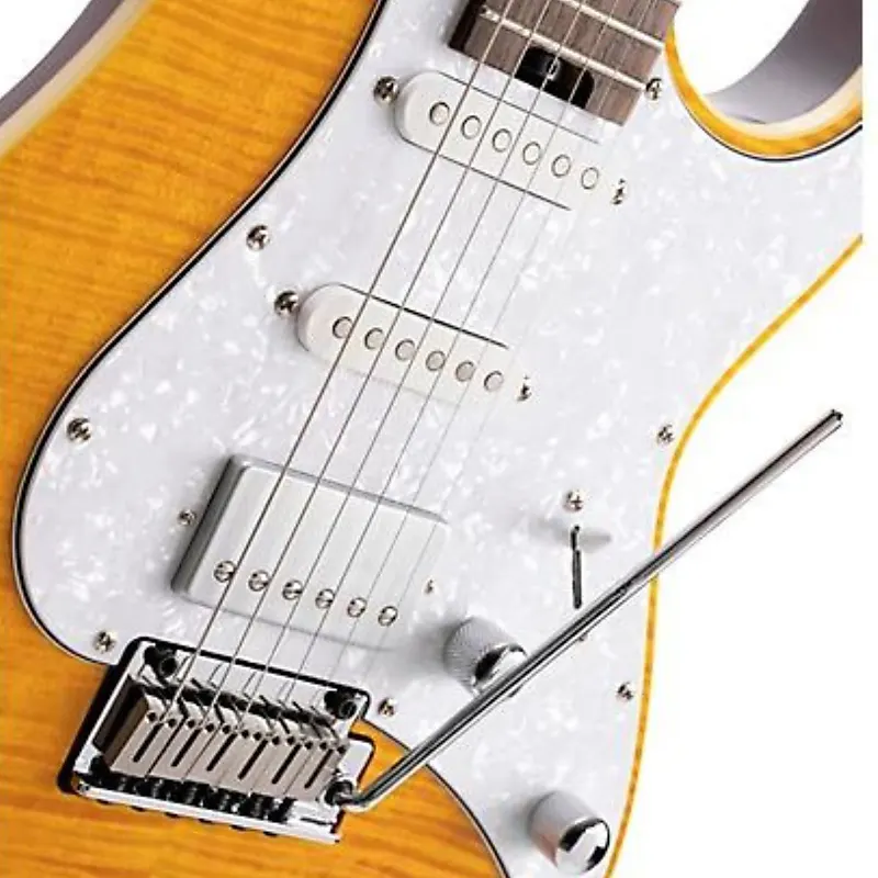 Корпус из ольхи обеспечивает теплое и насыщенное звучание, а верх из клена-фламинго не только придает визуальную красоту, но и делает общее звучание более четким с выраженными высокими средними частотами и яркостью.