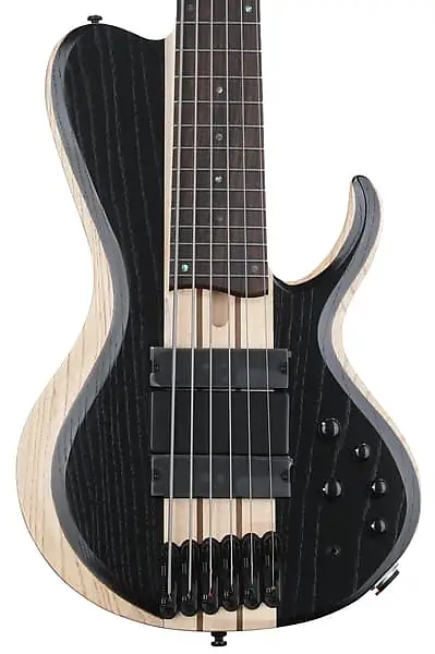 6-струнный электрический бас с верхом из ясеня, крылья из ясеня/окумэ, сквозной гриф из клена и ореха, грифовая накладка из розового дерева и 2 звукоснимателя Bartolini BH2 - выцветший черный, низкий глянец.