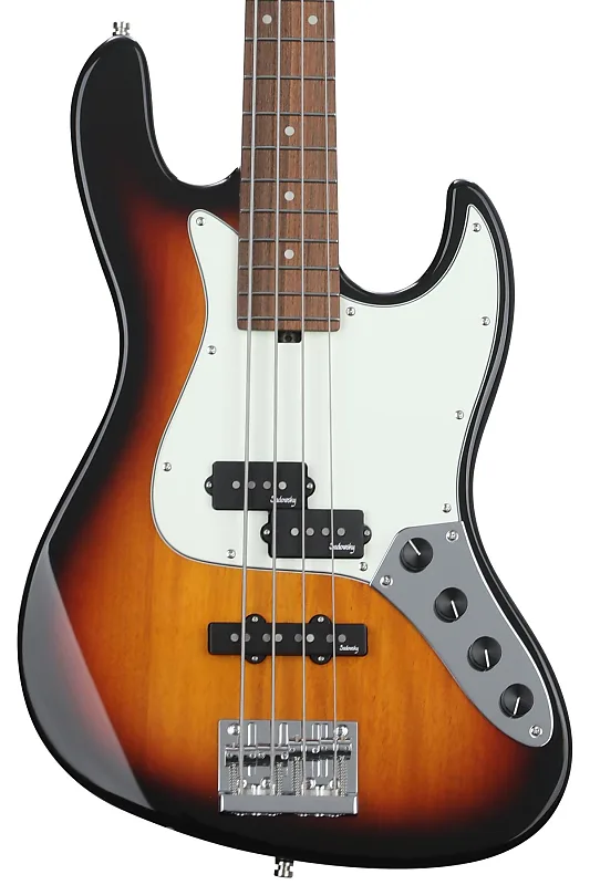 Электрический бас-гитар 4 струны с корпусом из Окуме, гриф из клена, накладка грифа из паверро, активный предусилитель, один сингл-котлкустик и один сплит-котлкустик - табачный солнцеобразный прозрачный.